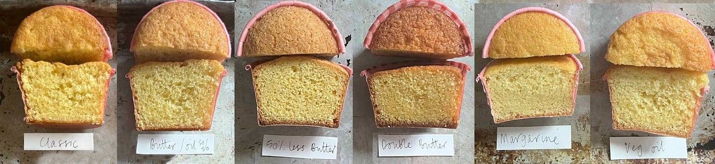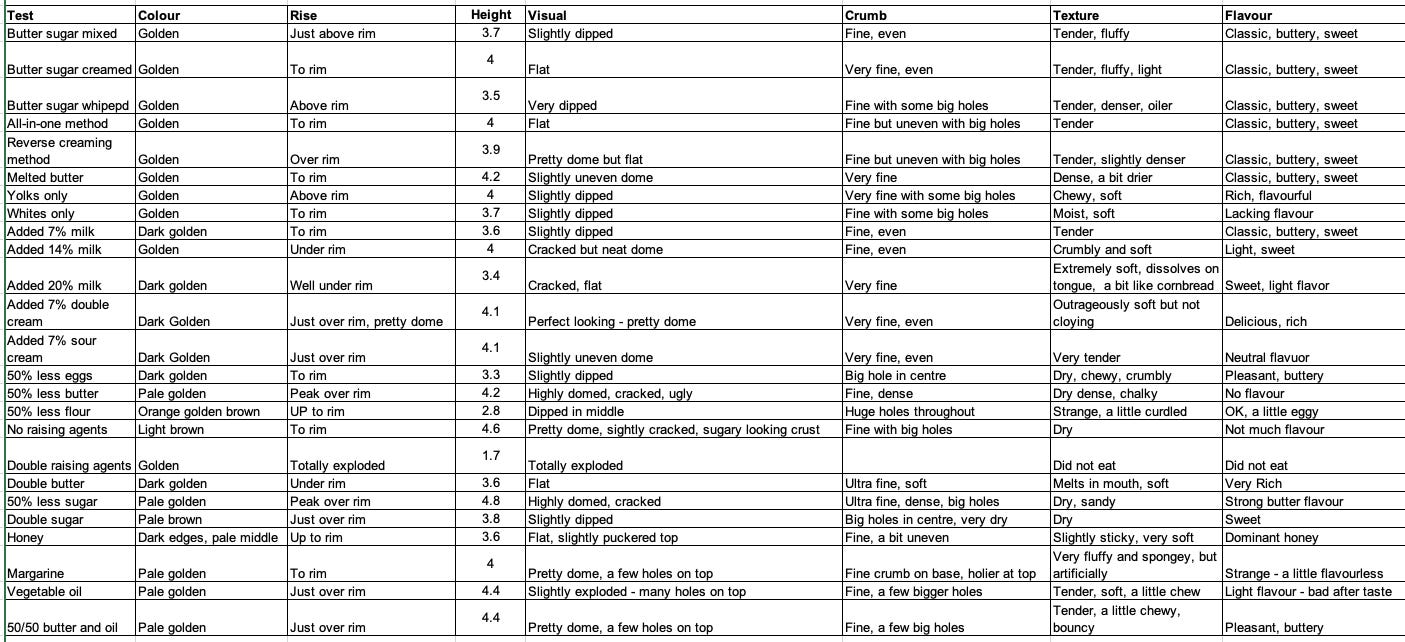 I was excited about this test - fat is where it's at! Fat is essential for tenderising cakes and is the predominant flavour. During the mixing process, fat coats the flour, which helps inhibit gluten formation in the presence of water, much like the 'rubbing in' process we know and love from pastry or biscuit making. As well as this, fat is really good at holding onto air (see 'creaming' section earlier).