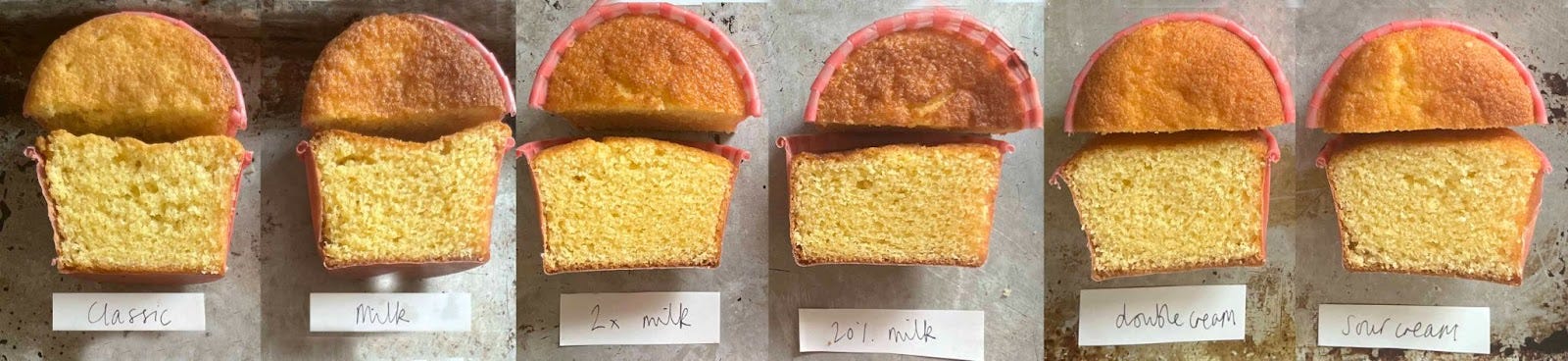 Conclusion: Double cream was a surprising front runner here - in its absence, a small amount (7%) of whole milk was a close second. Adding a lot of hydration without fat is not very effective for the victoria sponge - it dulls the buttery flavour and makes a wet crumb that is not unpleasant but is not suitable for this cake.