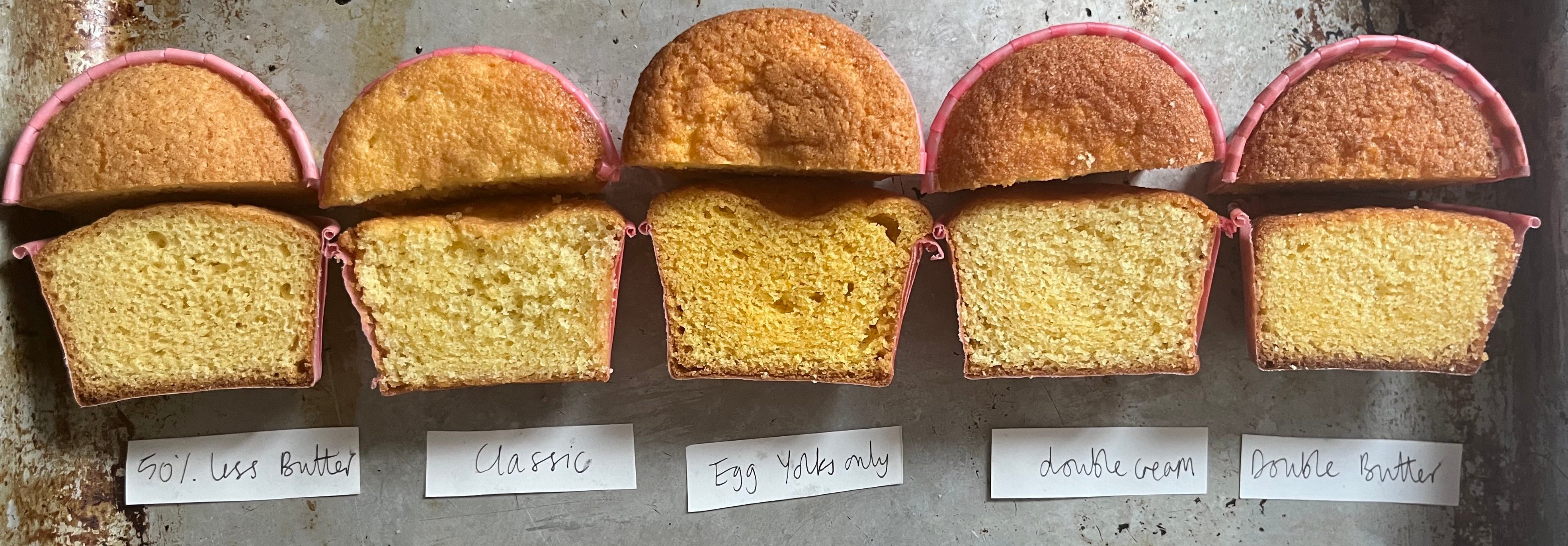 As you can see, the crumb, browning and texture radically change as we deviate from the classic. From collapsing to rising, fine crumbs to wild crumbs, the way we marry ingredients together really matters. Other than the ½ flour, none of these cakes were inedible - they could all have been doused in cream or filled with jam, and you probably would have enjoyed them. But it's interesting to track cause and effect. And I'm still dreaming about that double butter one.