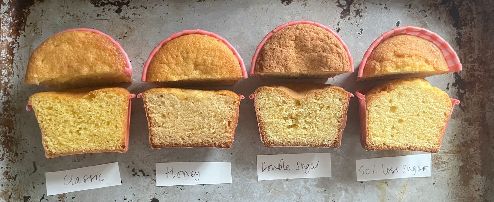 The cake with 50% less sugar was highly domed - the tallest of the cakes - and was very dense and dry. Since the sugar is not occupying the water, there is much more 'free water' available for steam, resulting in additional leavening power. As a result, more moisture is lost, resulting in a drier cake. On the other end of the spectrum, a cake made with double sugar is also extremely dry and has collapsed in the centre because too much tenderising has weakened the structure. Such a large amount of sugar also gave the cake a rusk-like, dry texture with a thick crust. The honey cake was very tender and moist with a robust flavour - to my surprise, it didn't rise more, despite having more liquid. I expect this is due to the lack of air incorporated/missing from the creaming stage.