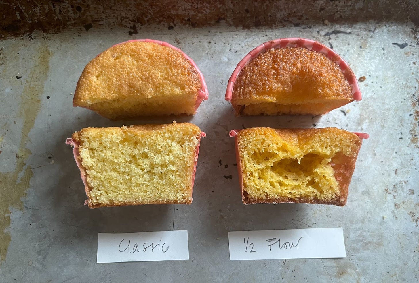 I like to think of flour as a bulking ingredient for cake. Although we can't help gluten from being formed - it will happen as soon as flour comes into contact with water - we don't want to encourage it. We need there to be enough structure for the cake to actually take form and for there to be enough of a protein mesh to capture the air bubbles as they expand in the oven, giving a cake its final texture. As you can see below, drastically reducing the flour is not a good idea: