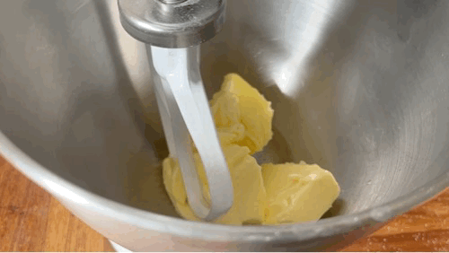 Cream the soft butter with salt and sugar for 2 minutes on medium speed using a kitchen aid. This is enough for the butter and sugar to aerate slightly and become a little paler, but not so much that it is whipped. It is better to err on the side of caution.