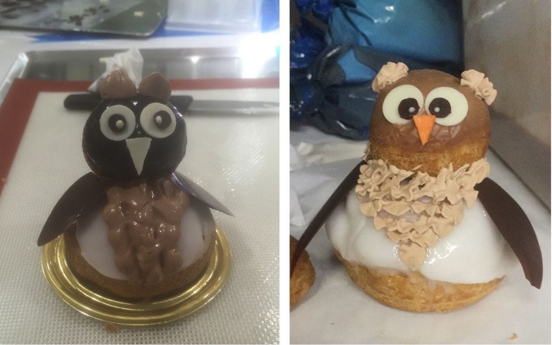 Hooty was a gorgeous creature with a caramelised milk chocolate whipped ganache in the rotund base. We managed to get the fillings just right and the buns just-so… but when it came to the decoration, we really let Hooty down first time around. On the day of our tasting, I brought the buns, fillings in piping bags and tempered chocolate décor to my head chef and we assembled it. Our first attempt? Hooty looked like he had seen things he couldn’t unsee. A few hours and new batch of ganache and orange beaks later, hooty had recovered (thanks to some top tips from Chef Karys about how to make a cute religieuse, which I’ll share later) and was back to his gorgeous self. Every time I see the ‘before’ picture of Hooty, it always makes me laugh: