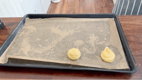 Transfer into a piping bag and cut a 1.5-2cm hole in the bottom. Pipe 6 x 15g choux buns (you can scale the piping bag each time) and 6 x 5g choux buns (these are soooo tiny!!!) – pipe a few extra if you have leftover mix