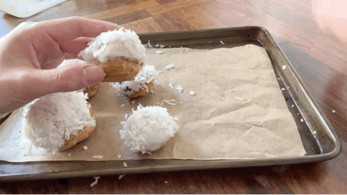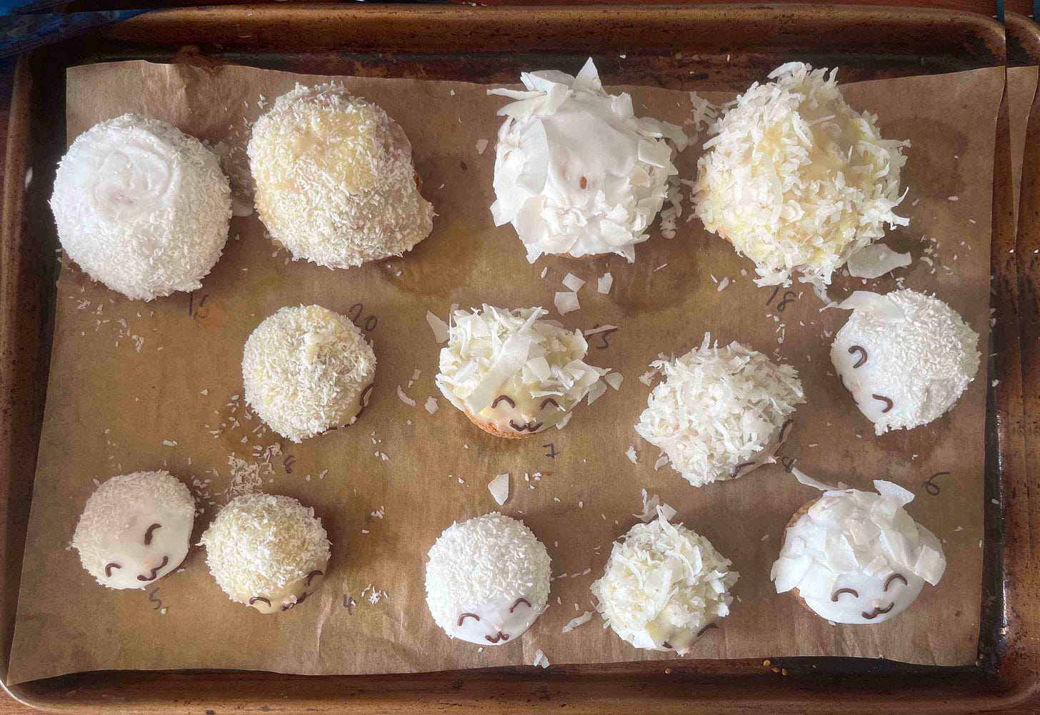 For the head, dip 2/3 into the icing and shake off any excess then leave upside down for 10-20 seconds to dry to make sure you get a nice clean line for the base of the face. Then dip 80% of it in the fluffy coconut, making sure to leave yourself space for the face! I would test one first to check you are happy with it