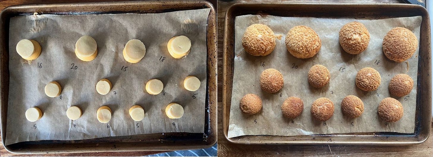 Cut craquelin to cover the buns – the small I use 1.5cm cutter and for the large it’s the 3cm cutters. If you have kept your craquelin in the freezer, let it come to temp slightly, or warm with your hands, otherwise it will just crack