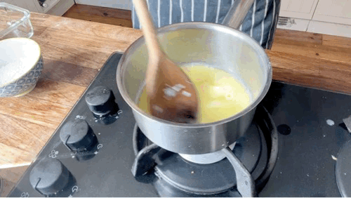 Pour the hot milk over the yolks and whisk then pour it back into the saucepan – keep stirring until it thickens and bubbles