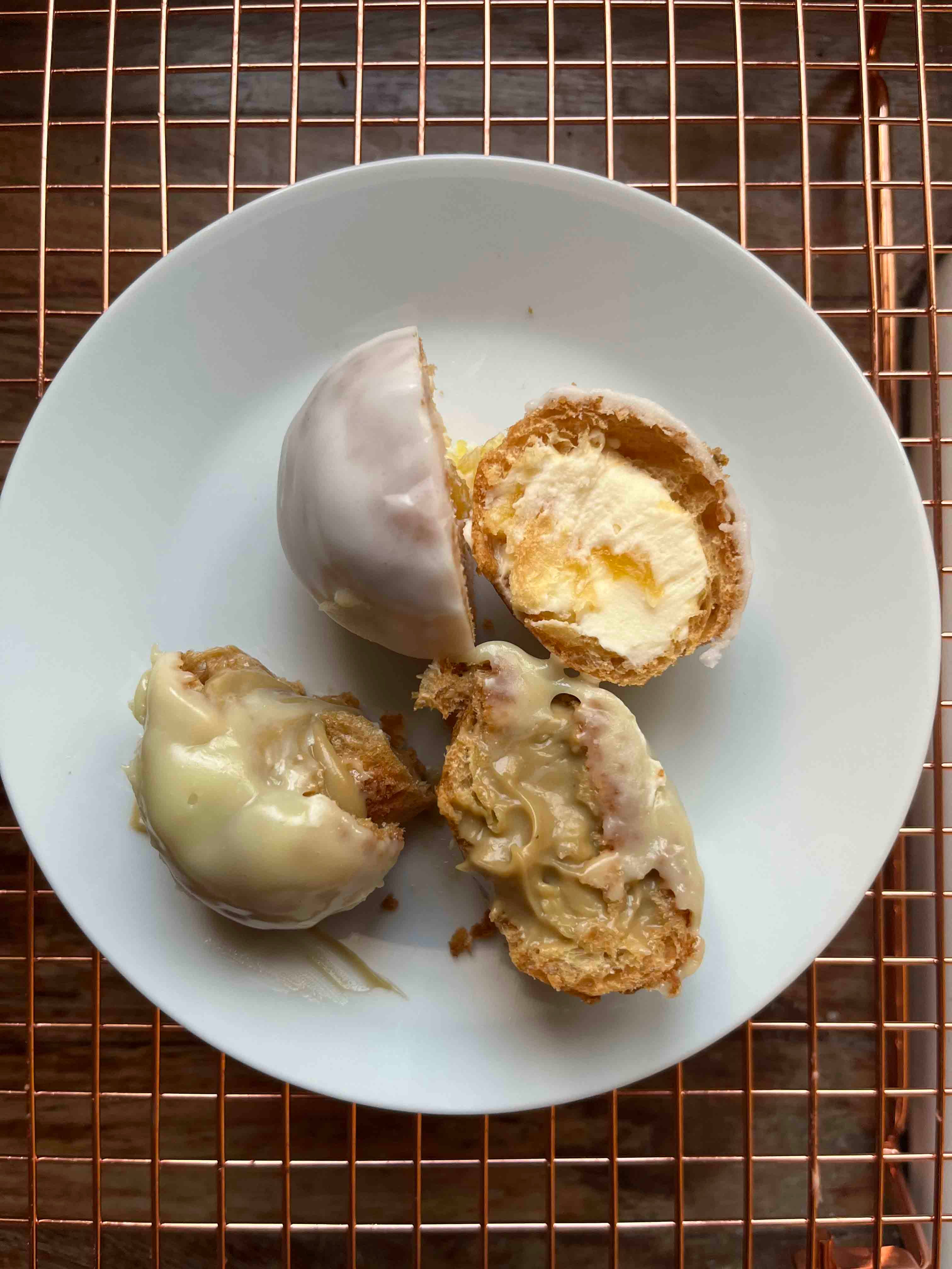 Flavour wise, I thought it– it was spectacular and rich with the pistachio; I know I am in the minority of people that actually really love white chocolate, so I was rooting for this one.. but sadly not. The lemon icing is a simple mix of lemon juice and icing sugar, around 0.2:1 ratio – although I was gunning for the white chocolate, the lemon icing won quite easily in both flavour and ease. Getting the ‘right’ consistency for the icing can be a bit hit and miss and you may need to tweak and adapt my ratio depending on what brand of icing sugar you are using – you want the icing to be thick enough to adhere to the choux bun whilst not being chunky, but not so thin it runs off in a stream.