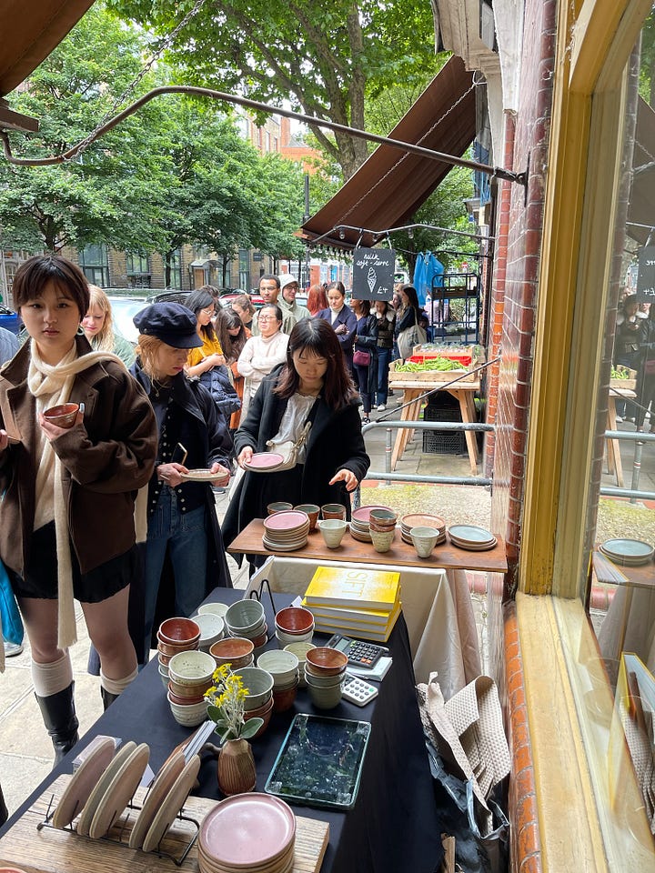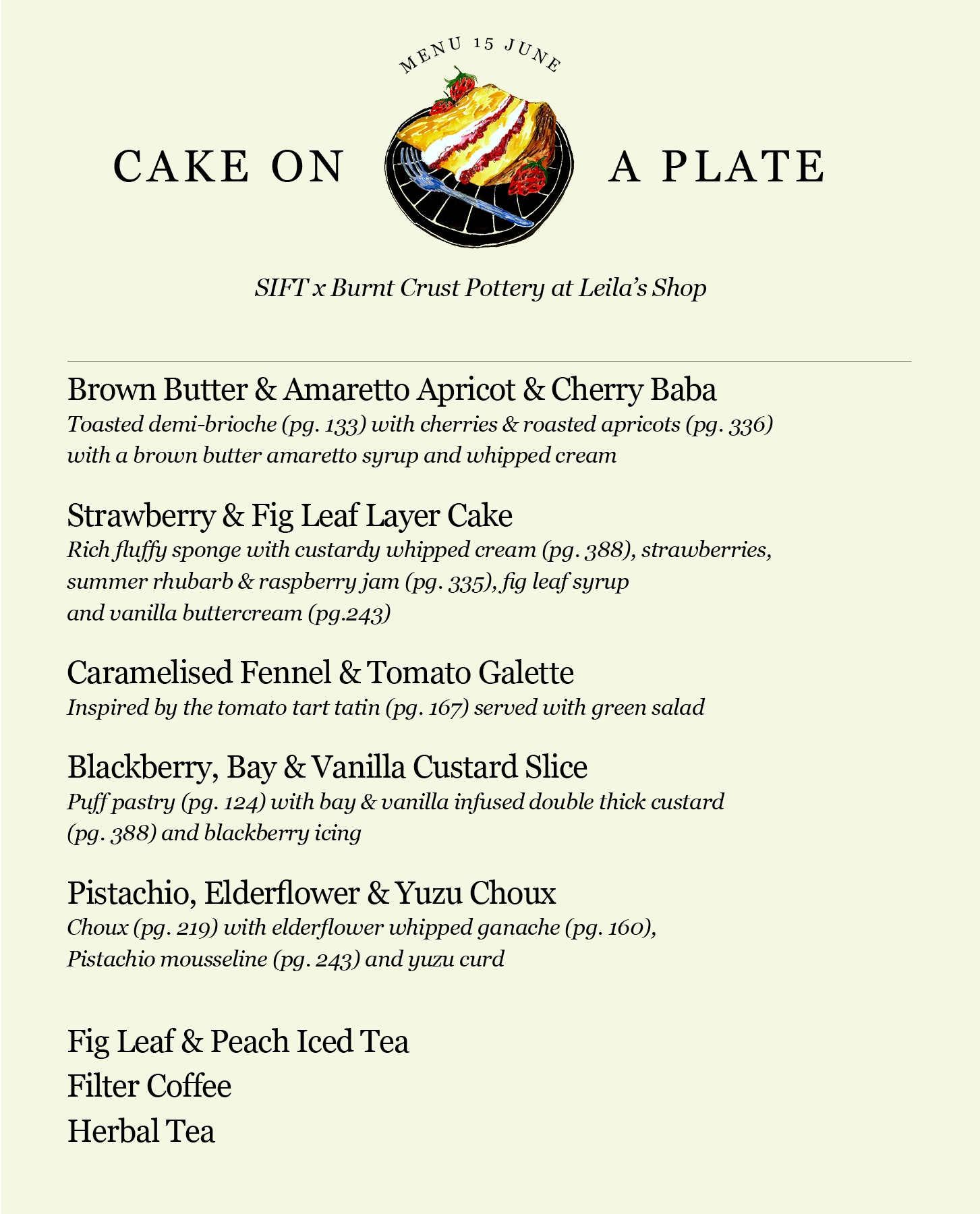Yesterday I had the complete pleasure of collaborating with Burnt Crust Pottery on a very special Cake On A Plate! event at Leila’s Shop in London. Nichola Gensler, aka Burnt Crust Pottery especially made a bunch of gorgeous perfect cake-sized plates and I came up with a very special menu inspired by SIFT, my debut cookbook which is out now! It was a lovely afternoon, despite the rain. And lightning. Umbrellas were shared. Cake was demolished! Nichola will turning Leila’s (Calvert Avenue, e2 7jp) into a pottery shop today from 11-4, in case you want to check it out!