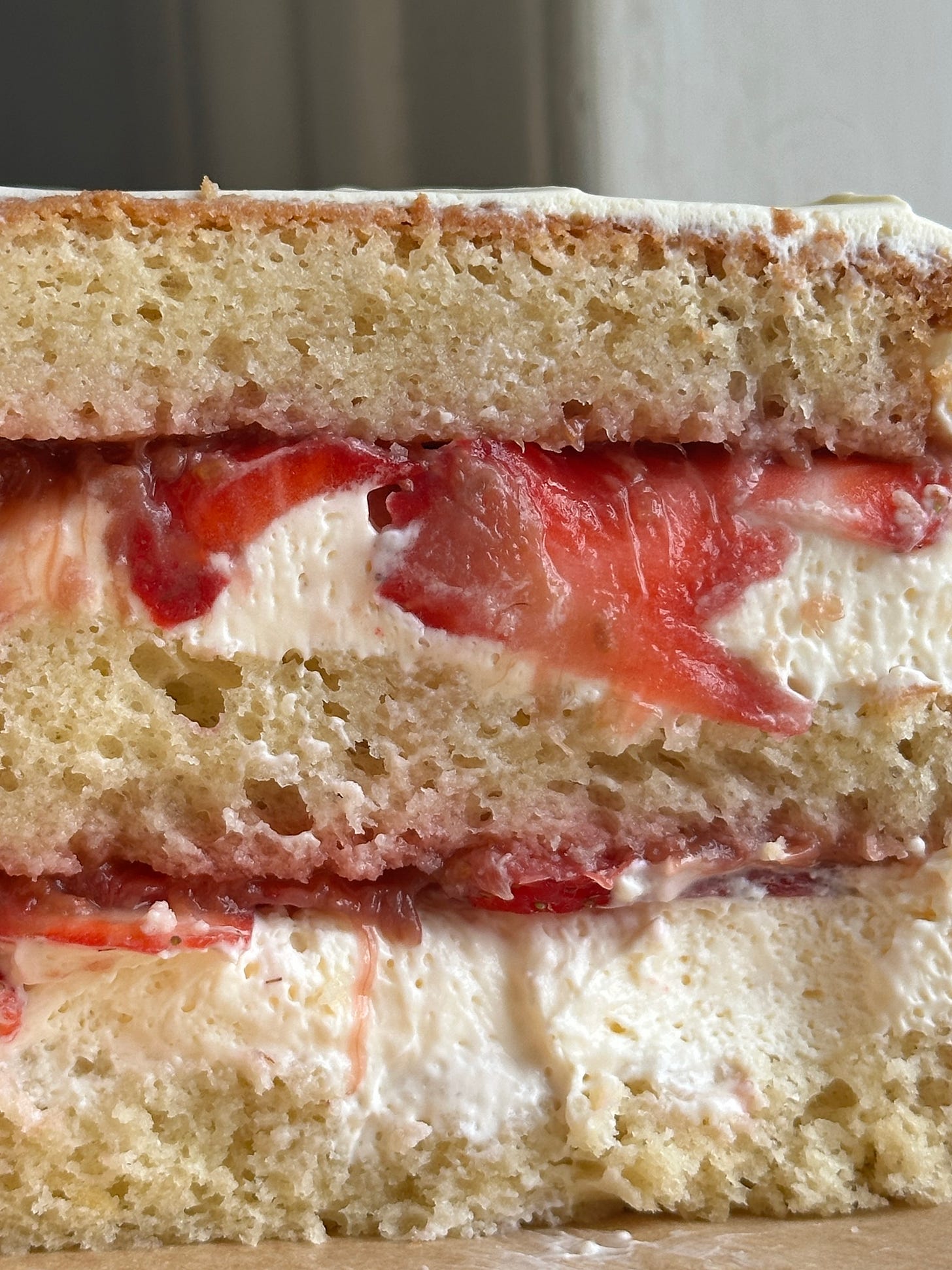 Fig leaves are back baby! With strawberries, they are an unstoppable combo. I had originally wanted to use genoise as the base here, but I needed something a bit heftier to hold up to the layers of jam, custardy cream and fruit, so I went for rich chiffon from this recipe. I do love the way thinly sliced strawberries eat, but if you want this to be easier to cut, I suggest doing strawberries similar to this recipe, larger chunks which can be sliced through easily.
