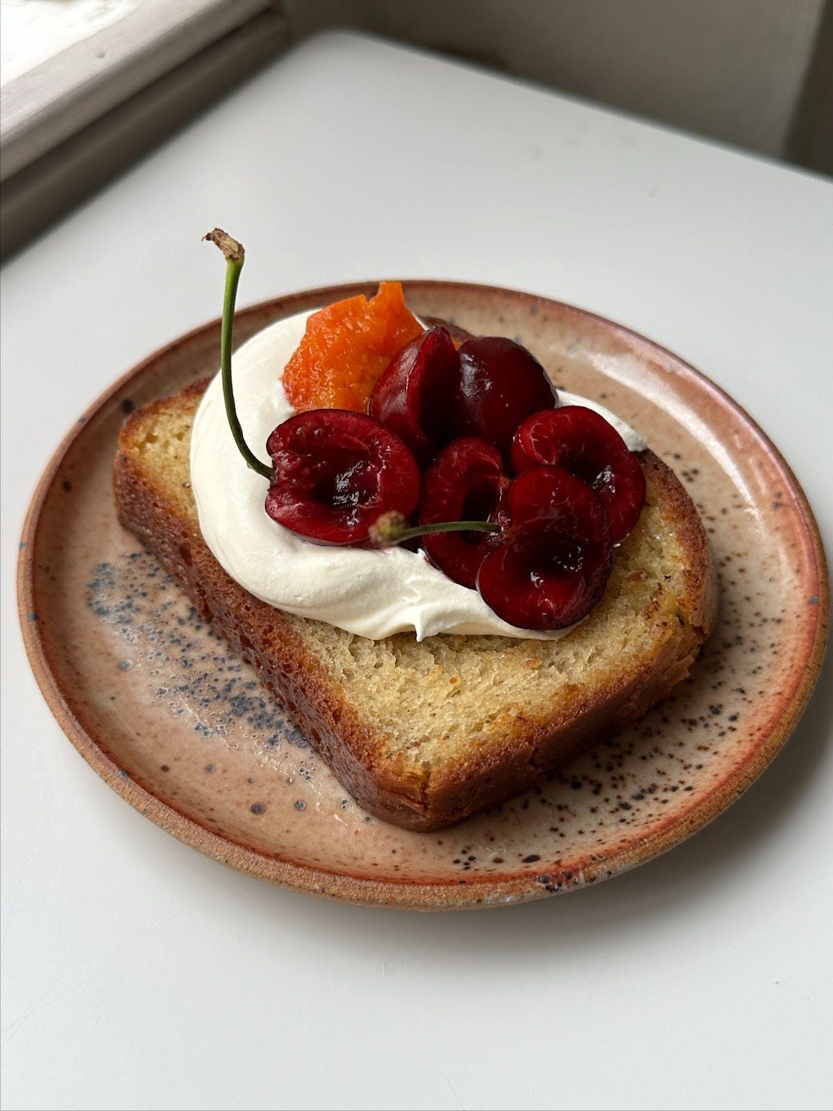 Inspired by and taking the lead from Camilla Wynne’s baba loaf on KP+, this dish combines the toasted demi-brioche (pg. 133 in SIFT) with cherries & roasted apricots (pg. 336 in SIFT). And rather than maple, I used panela sugar in the syrup.
