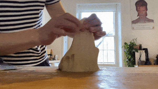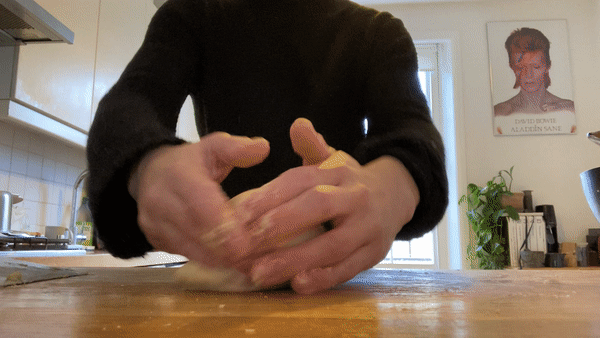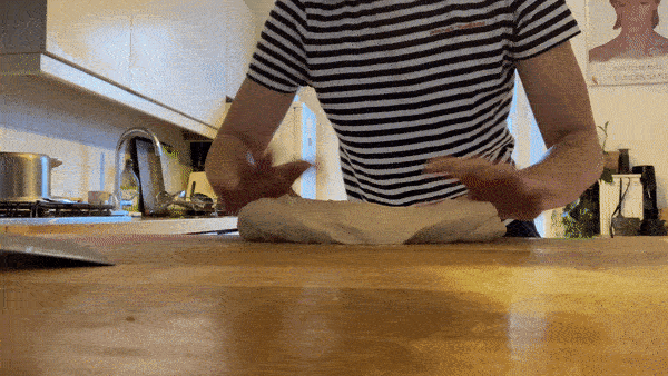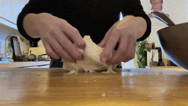 The first step is pretty simple - stretch the corners of the dough and stretch it back into the centre until an approximate ball begins to form. Also observe the dough - when you stretch it, a slight skin begins to form. You want this.