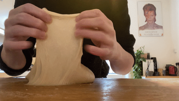 After you’ve been banging your dough around for 10 mins, it wont actually be able to reveal its full stretchy potential. To properly assess your dough, allow the gluten to relax by resting the dough (covered, I use an upturned bowl) for at 5 mins. After this short resting period, you’ll be amazed at how your hard work has paid off and you’ll get a mammoth windowpane. YOU DID IT!