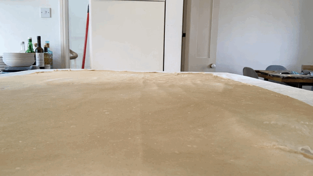 Continue stretching until it’s as thin as you can - mine was about 95cm x 65cm by the end. If you want to test out your skills, see if you can easily read a page of writing through it. Don’t worry too much if there are little holes in the dough. Just stretch around them and pinch them back together. You won’t notice too much later on