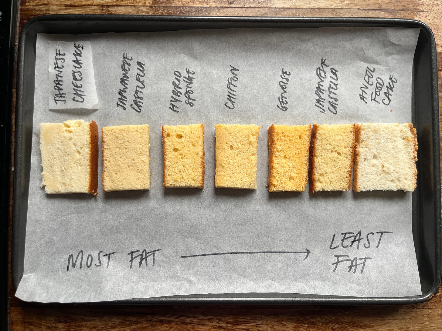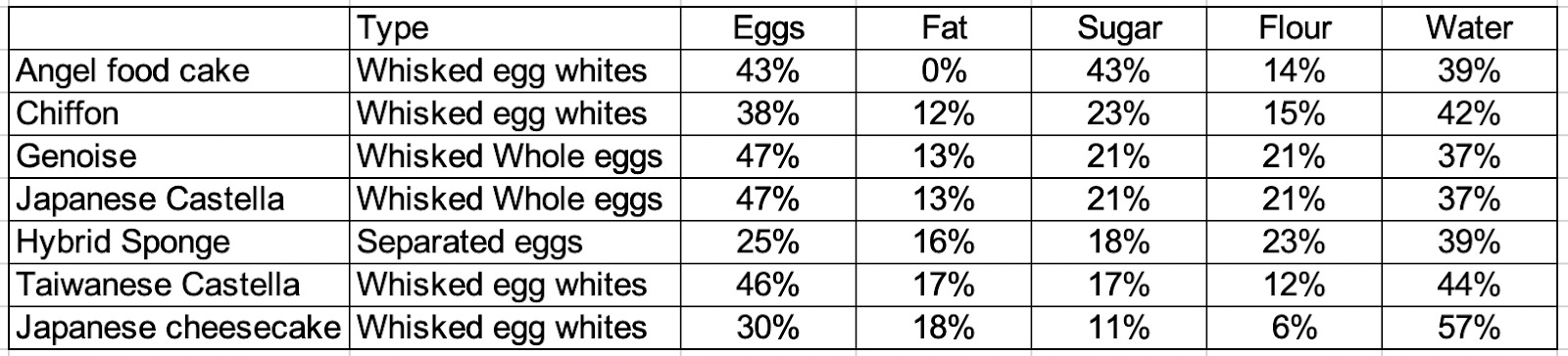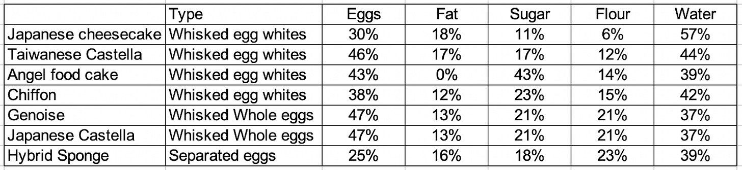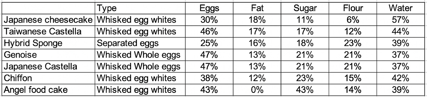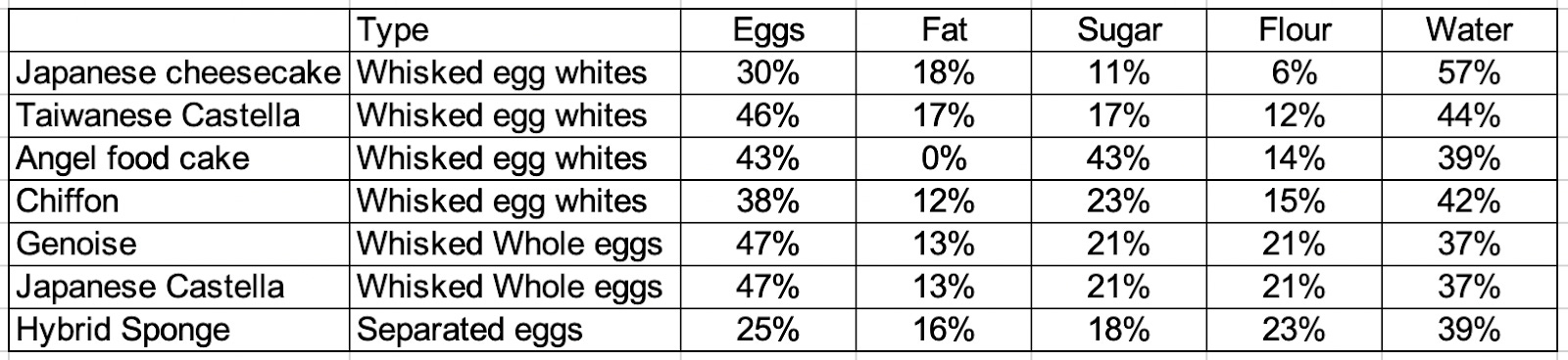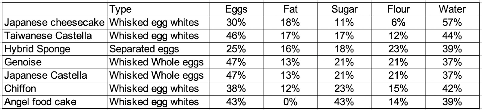 We also need to be aware of how we will capture all that water - this means trapping it with the help of flour (gelatinisation), occupying it with sugar or setting it with eggs (coagulation). But ultimately, if the moisture in the cakes is low, you can really taste it when you eat it. The cakes with the lowest moisture % are fluffy and tender but aren’t moist. This is why these cakes are often paired with cream or syrups, while chiffon, Taiwanese castella or Japanese cheesecake can be enjoyed independently.