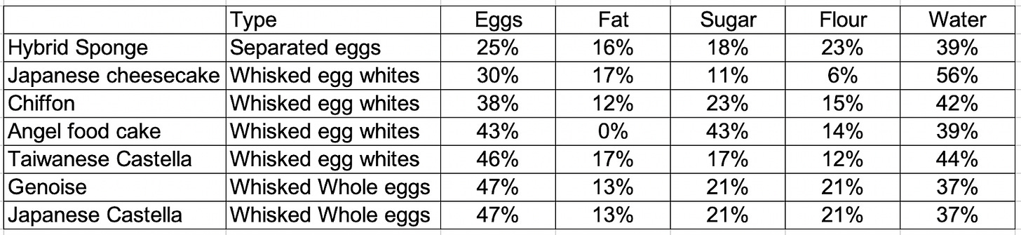 The cakes that use whisked whole eggs have the largest amount of eggs - this is likely because the amount of air we can whisk into whole eggs is lower than whites, meaning we need a relatively larger amount of whole eggs to achieve a good rise.
