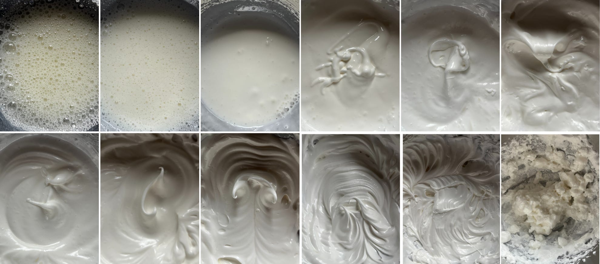 It should be noted that if left, the foam begins to set, turning from fluid and shiny to chunky. This is because egg proteins will continue to bond with each other even after the agitation has stopped, making your meringue hard to combine into another mixture.