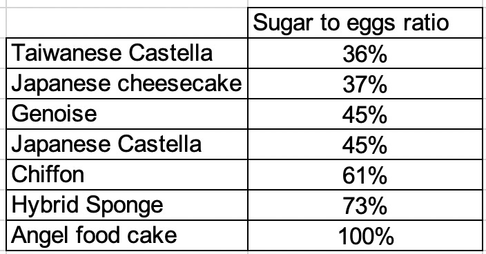The highest egg white to sugar ratio is the angel food cake, which is a 1:1 ratio. The lowest is the Japanese cheesecake - this makes sense. There is a lot of sugar and sweetness in the cream cheese and milk in the recipe (lactose, I love you!), and a tender meringue is incorporated easily into the recipe.