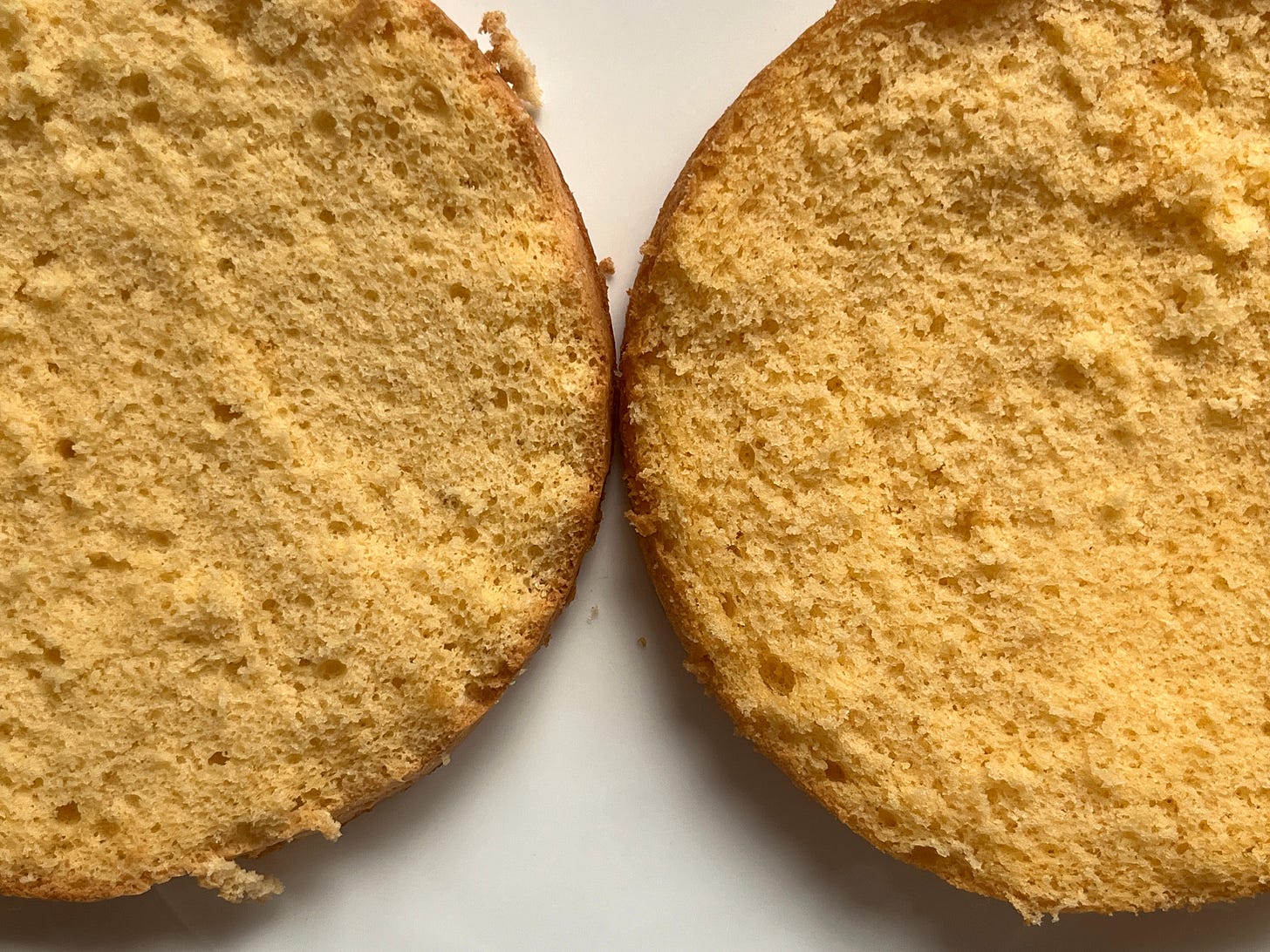 For one more outlier for the tests, I decided to try a hybrid sponge that bridged the gap between the richer sponge cakes with raising agents but also lightened with eggs, which are separated and whisked separately to foam before being folded together. It has a higher proportion of flour than most foam cakes - this means it has quite a lot of body but is still pleasantly squishy. I was VERY happy with this cake. I’ll share the recipe at some point here on the newsletter.