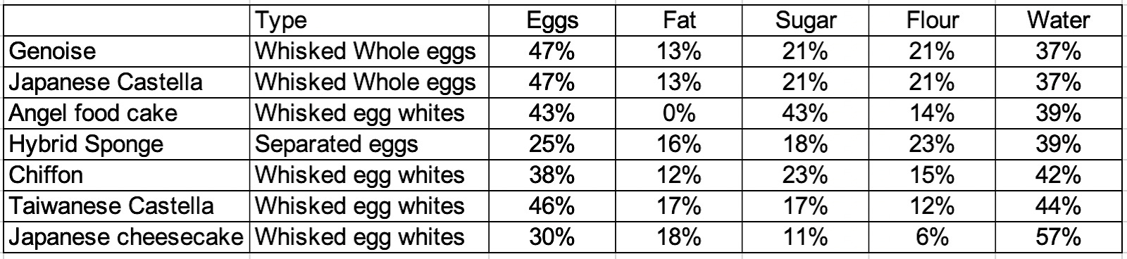 For airy foam cakes, flour does play a role, but it takes more of a back seat. Compared to a butter-rich cake with some 25% overall flour, the typical foam cakes I made ranged from 21% flour to a tiny 6% flour.