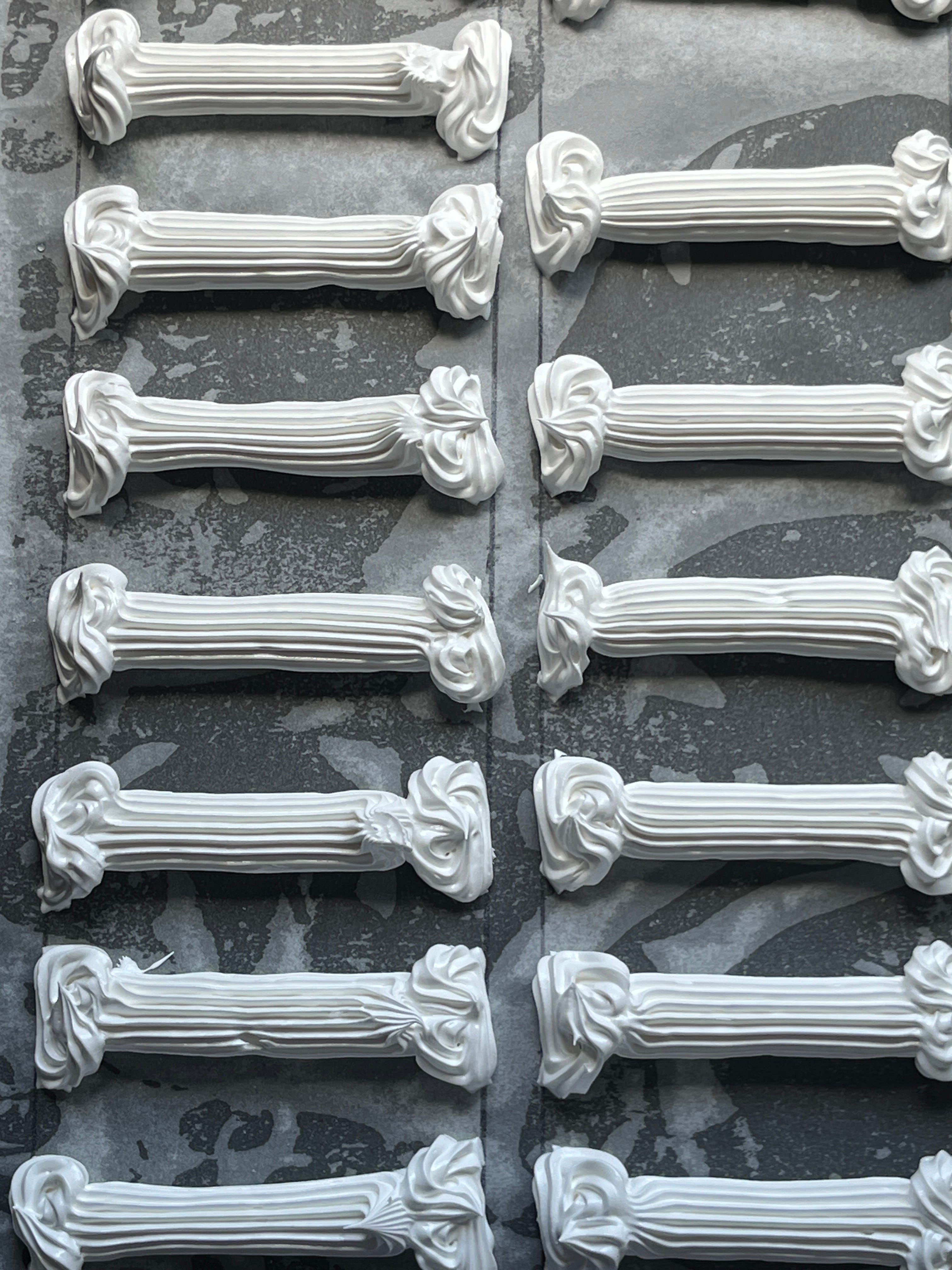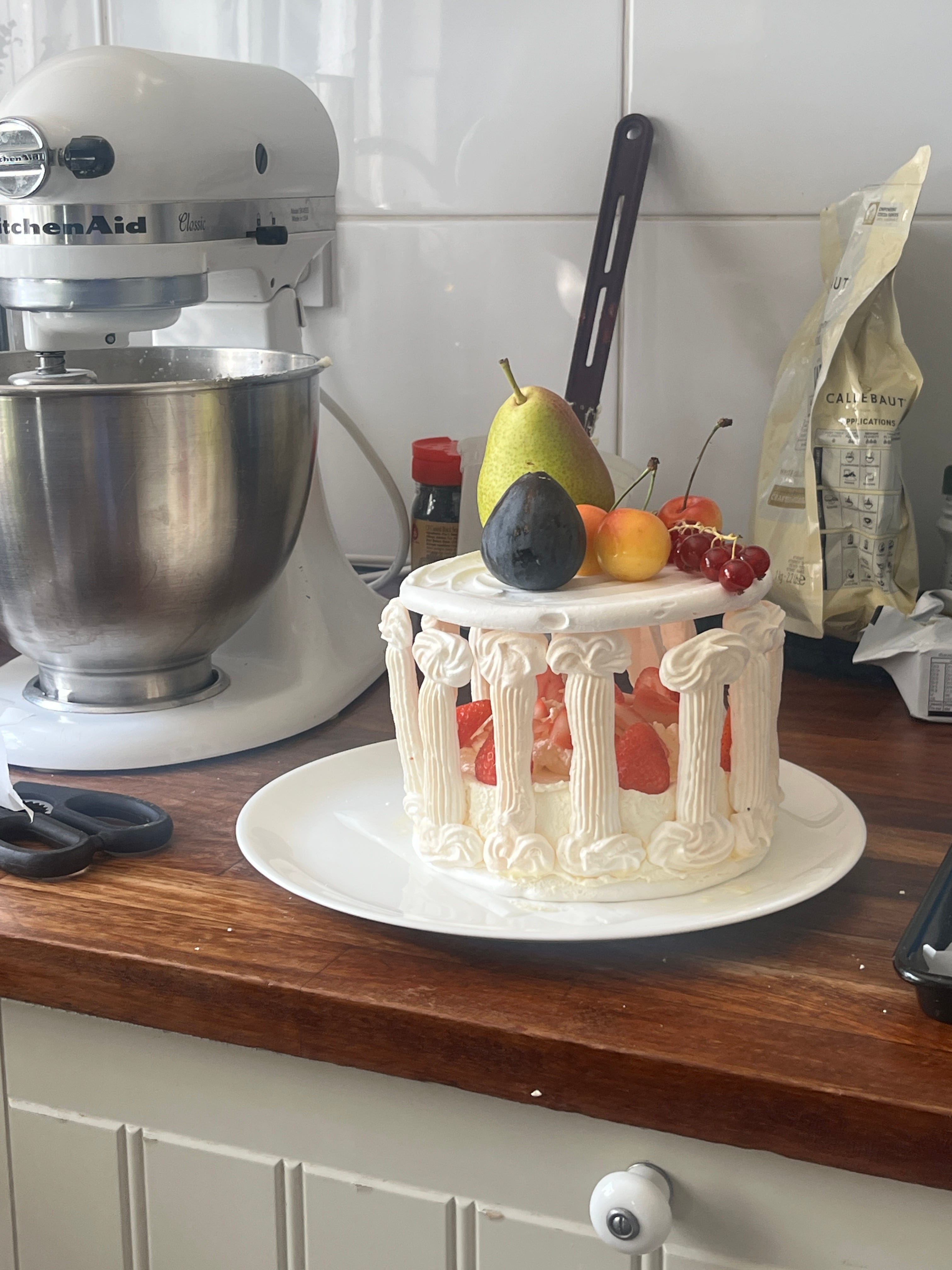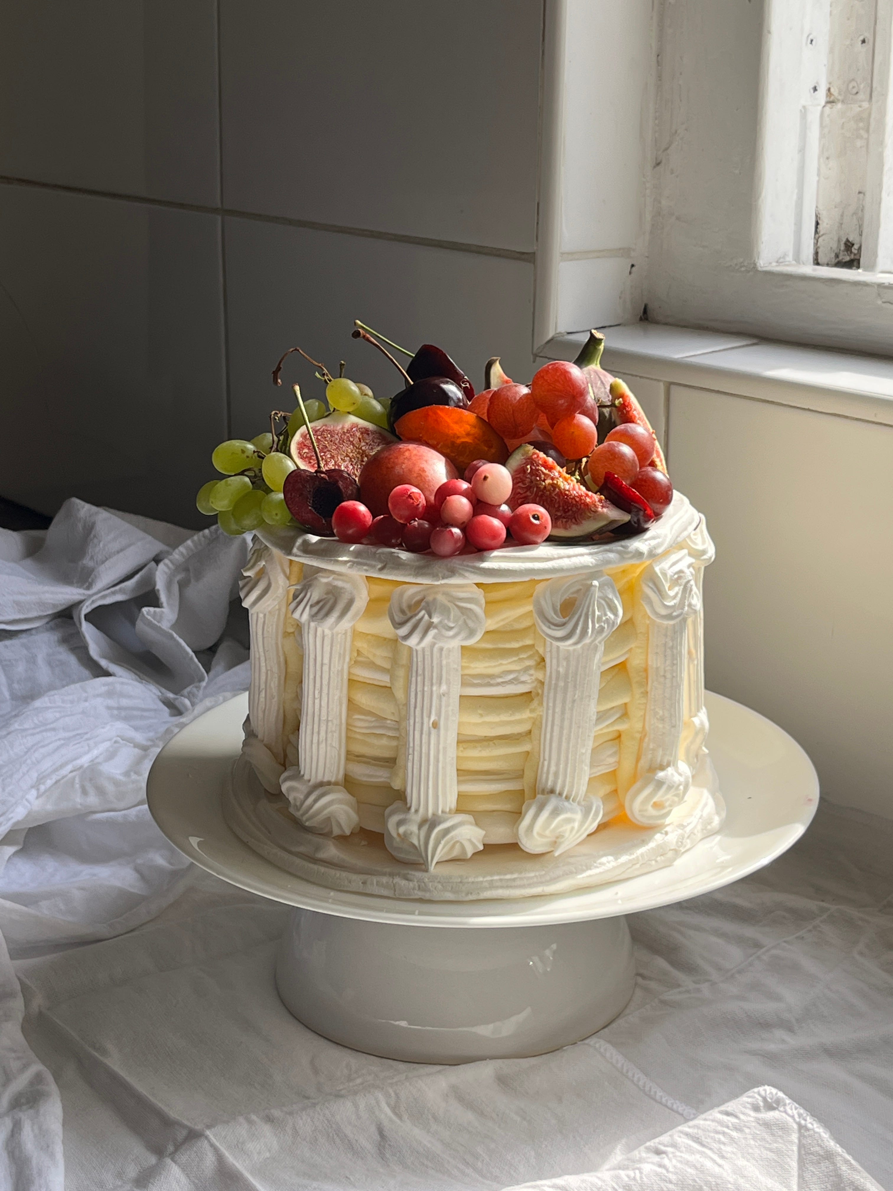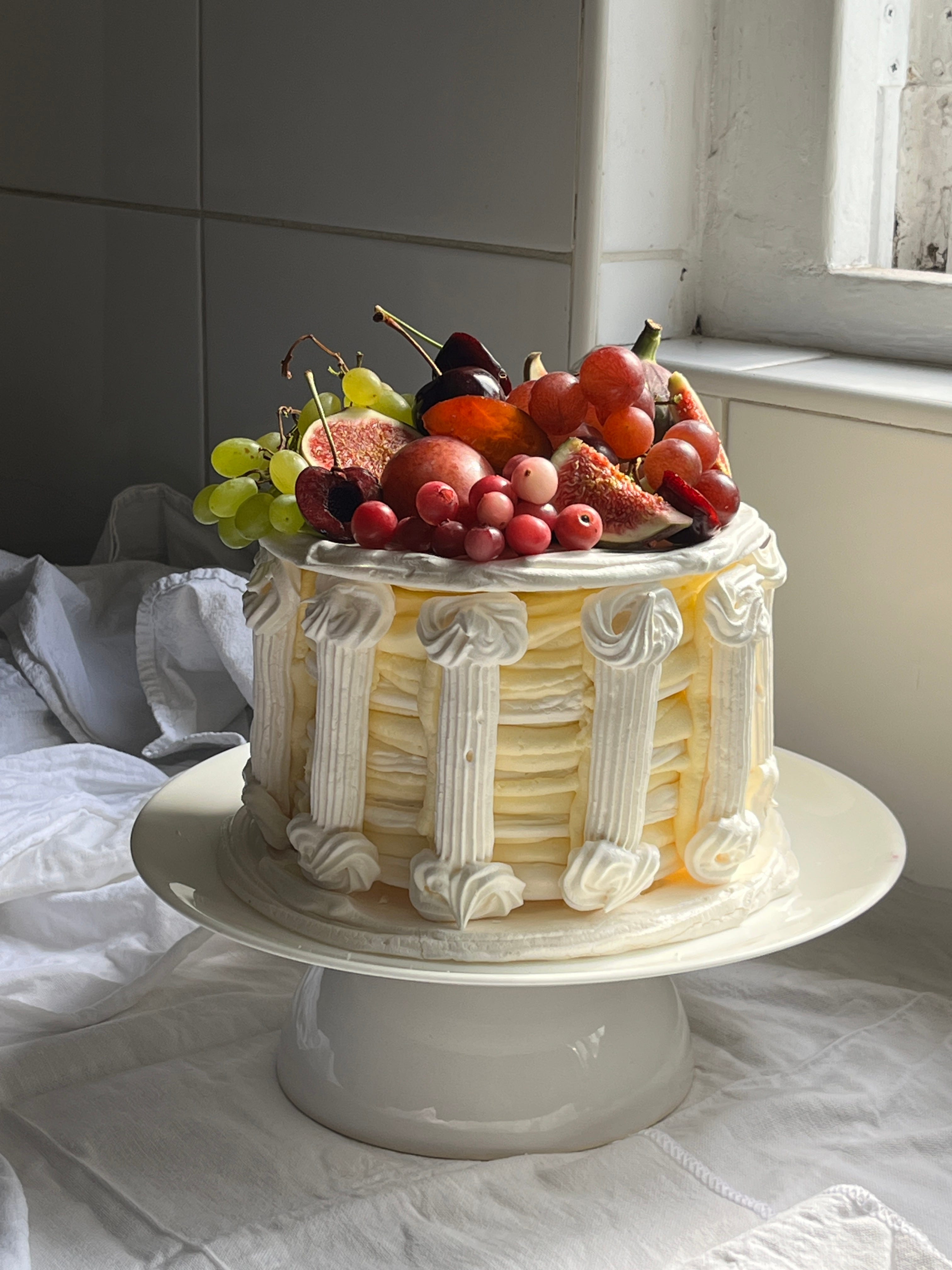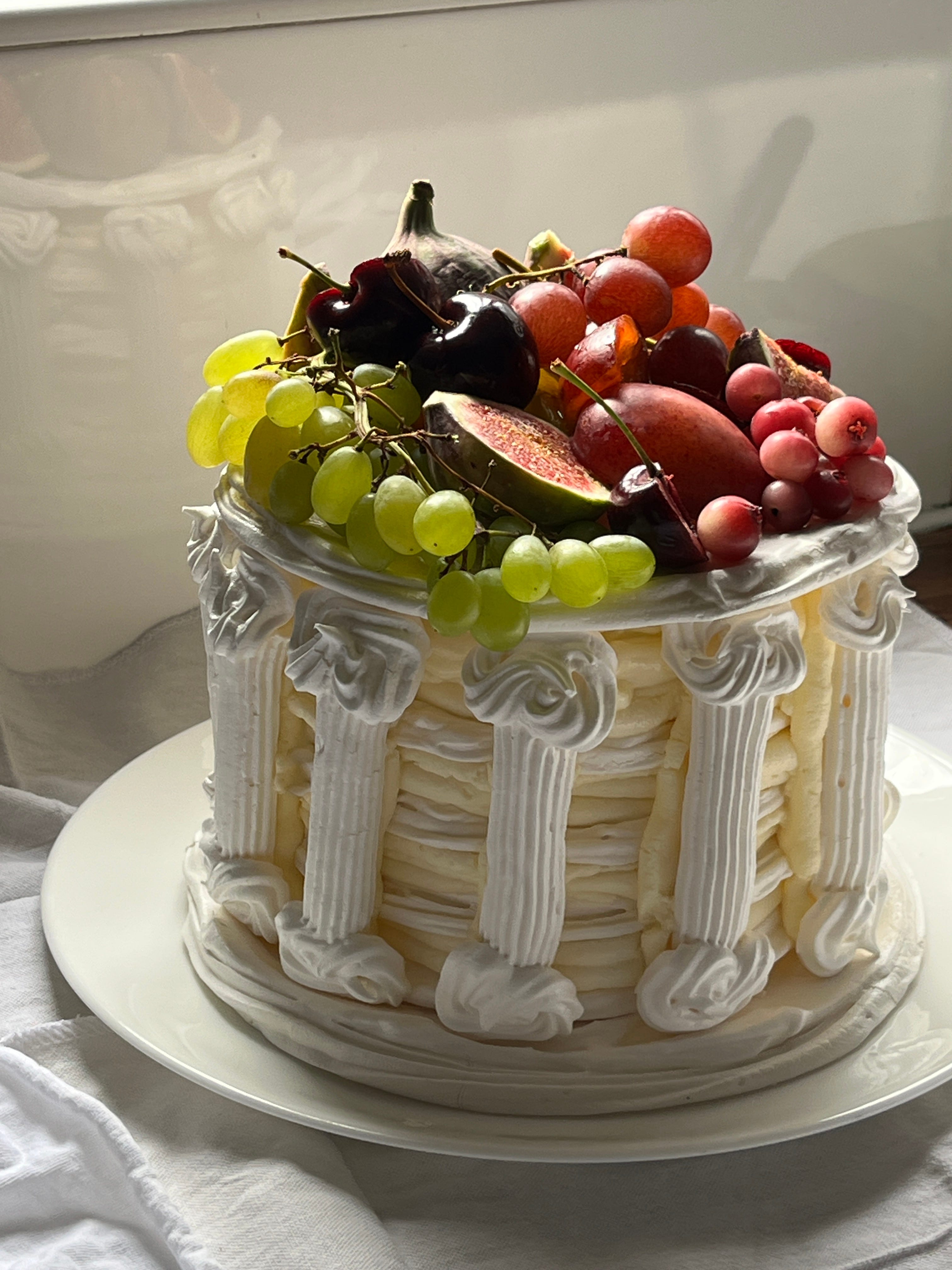 As summer was coming into focus earlier this year, I was suddenly struck with inspiration: Meringue Columns. Greek Ionic columns, to be exact, piped and baked and used as décor, a blend of classic design with modern techniques. But what if we took it one step further and turned pavlova as a concept into a plinth? An edible stand with a still-life fruit on top? With B.P.E (Big Pantheon Energy?) As I'll outline below, it was a long way to get there, but got there we did. It's giving BC chic: