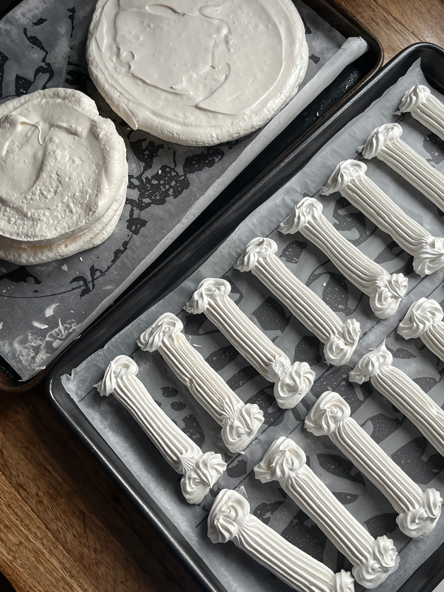 For my third attempt, which I hoped would be my final attempt, I piped a series of meringue discs in varying sizes and kept the columns to the 4-inch. The idea is to create a tower of alternating cream and meringue discs to create an internal structure (as well as being good to eat). To this, I affix the columns and, in theory, balance the slightly larger piece on top. Unfortunately, I made the top disc slightly too large and, in my attempt to resize the disc, created a hairline fracture in the meringue. Though it all started off great, and I was THRILLED with the look, the structure aggressively buckled under the weight. But I knew where I'd gone wrong and was satisfied with the construction, especially if I stabilised the cream. At the end of the day, if it DOES crumble, it suits what we're trying to depict anyway, right?