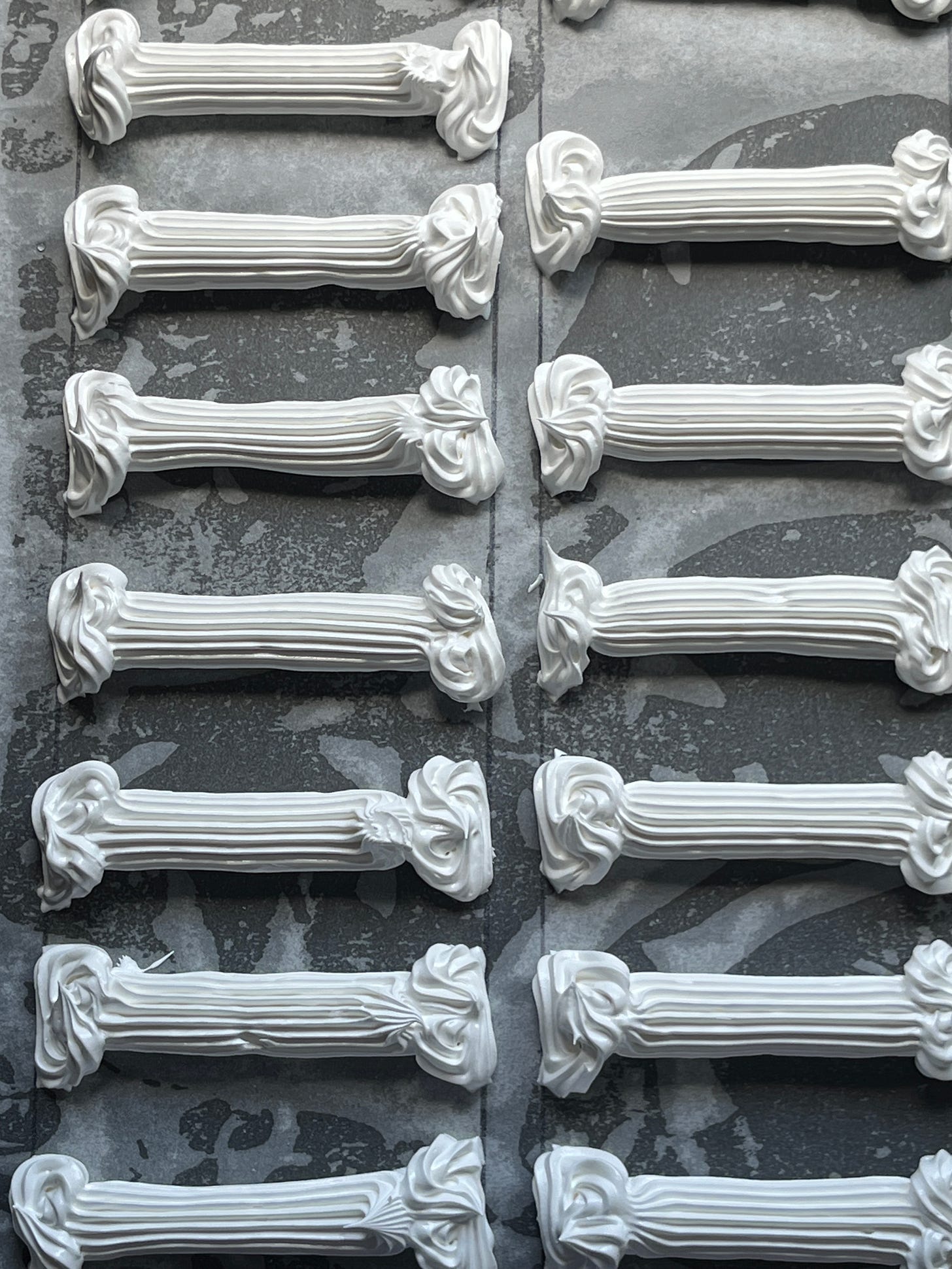 I'm confident we're going to be seeing a lot more meringue sculptures in the near future. Of course, meringue as decoration is nothing new – little spiky kisses, shaped adorning cakes, or ghosts at Halloween have long decked the halls of Instagram. But standalone meringues as sculptures are having their moment as we head backwards? Forwards? Towards the fanciful, aforementioned pièces montées.