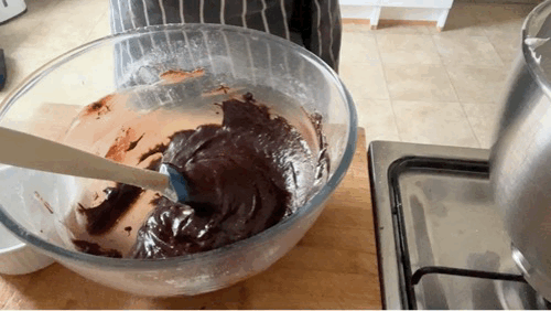 In 1-2 goes, add about 75g-100g of the meringue to your firm cocoa dough. Blend with a spatula, taking care to scrape any dry bits from around the edges, until you have an aerated moussey-looking dough. You will have to sacrifice the airiness from the meringue to get the cocoa dough to combine - that’s okay! It feels unnatural, but you’ve got this.