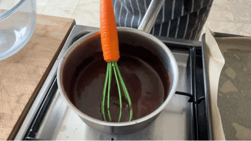 For the Cake, preheat oven to 140c fan. Whisk together vegetable oil, milk, cocoa powder, and 15g of plain flour in a small saucepan. Heat on a low heat, whisking well, until the mixture darkens and thickens. If you get it too hot, the oil will split out. Don’t worry, it will come back together. It will look like thick choux pastry. Remove from the heat, scrape into a bowl, and leave to cool for 1-2 minutes.