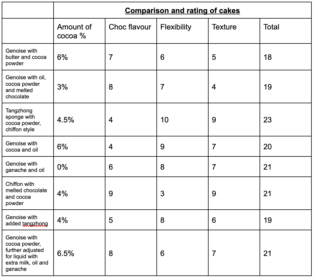 This week, I put eight sponges head to head. From my classic genoise and chiffon recipes, I adjusted to use cocoa powder, then additionally adjusted for liquid (as above). I also wanted to look into the best way to incorporate chocolate and cocoa flavour - from adding melted chocolate into the crumb, blooming the cocoa, to whipping in ganache as a fat source and testing the effects of oil rather than butter. I made all the batters and baked them in a small sheet pan, subdivided with paper. To test the flexibility, I rolled one cake as soon as it came out of the oven and left the other to cool completely before attempting to roll it up. In my tests, when I call it a ‘genoise’, this is when I’ve whisked whole eggs, while ‘chiffon’ refers to eggs and yolks treated separately.