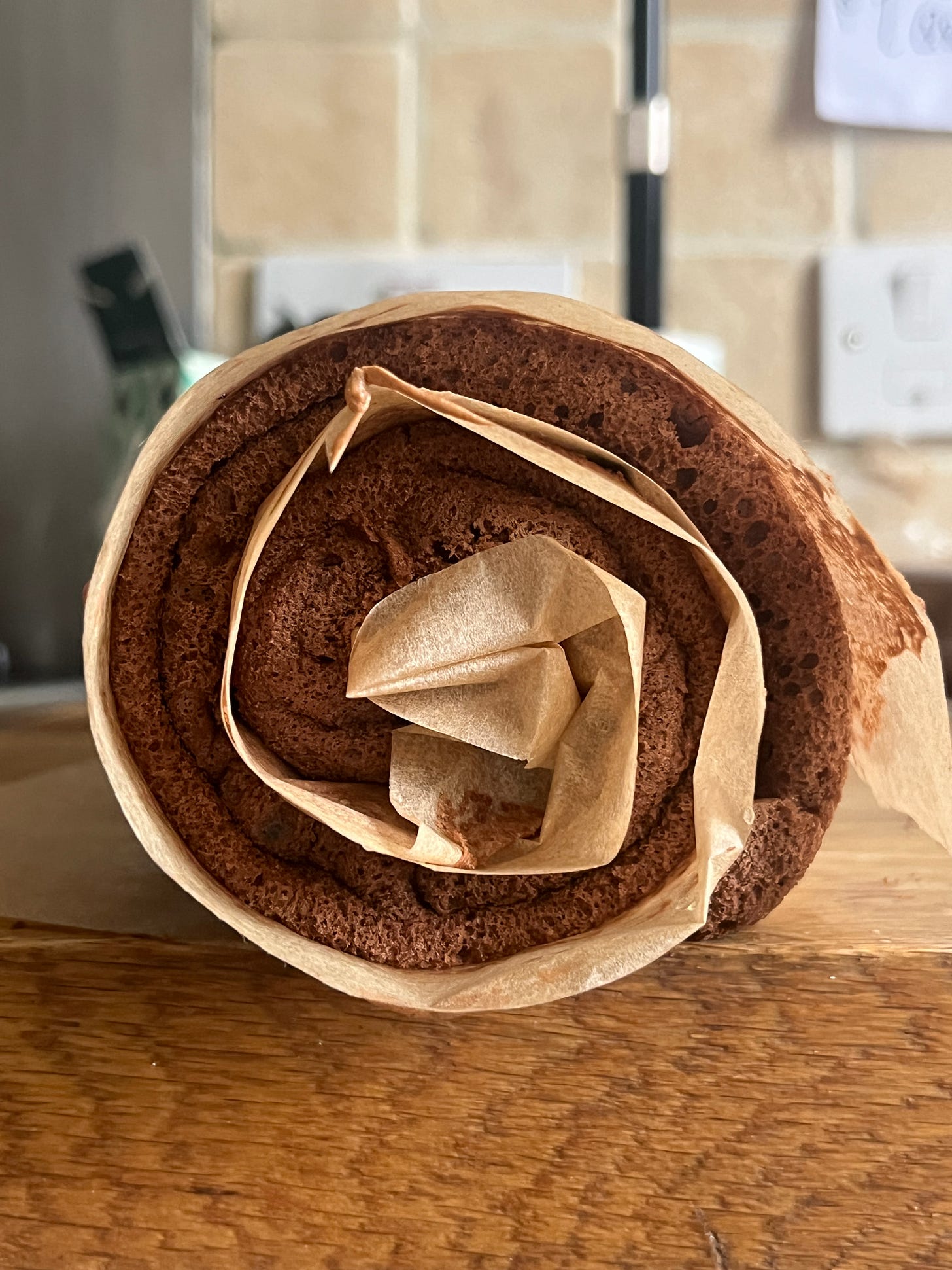 Flip the cake back over (so it's the same way it came out of the oven!), then roll it up gently. This isn’t a completely essential step, as the cake should remain bendy, but it is a good insurance policy. Leave to cool for 45 minutes - 1hour.
