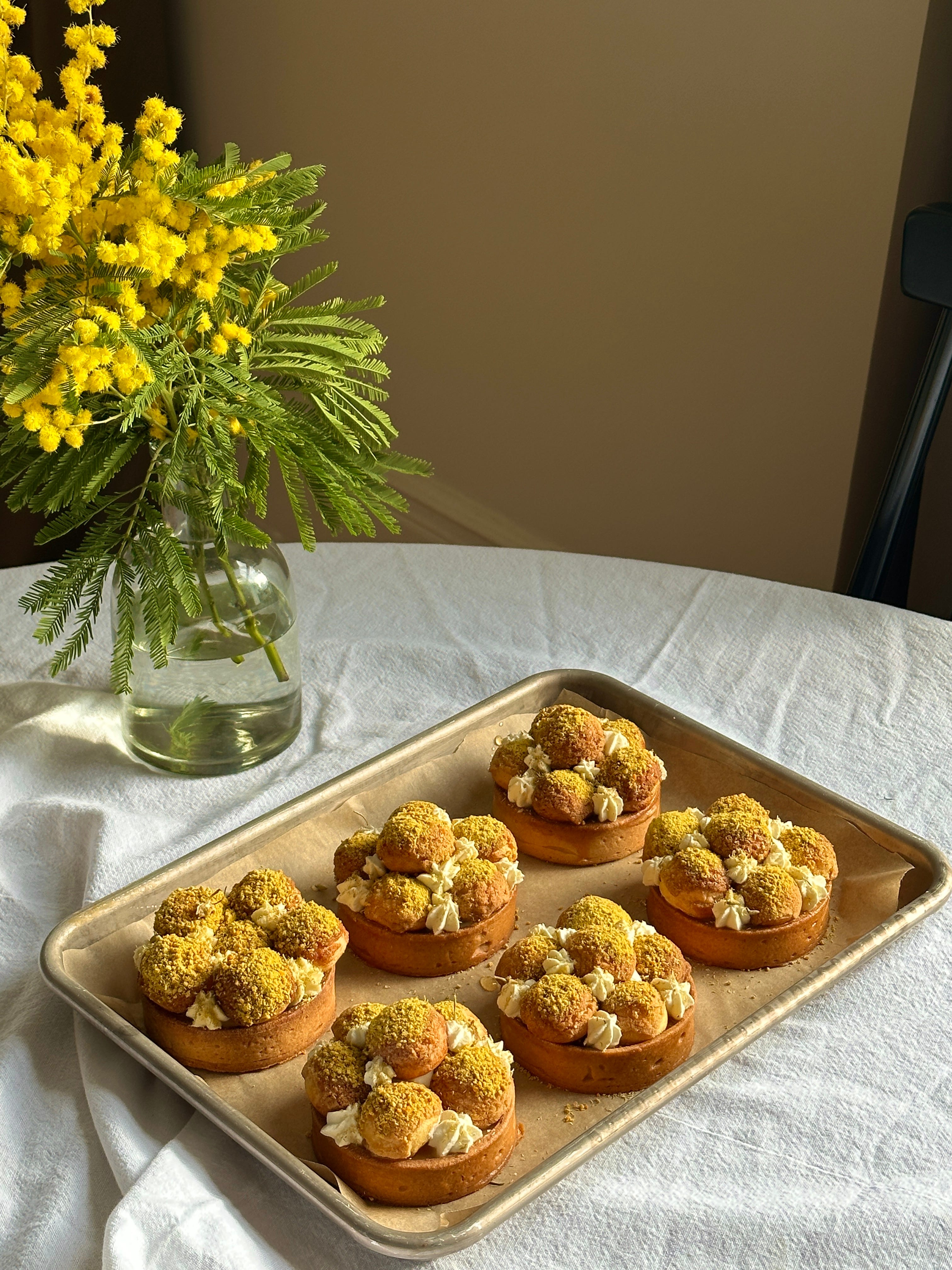 On KP+ today, I have the joy of sharing a new pastry for the IWD canon - the Mimosa Tart! Inspired by the fuzzy mimosa cake (recipe here from last year), this tart is a glorious coming together of texture and flavour. A crisp tart shell with a honey & chamomile filling, with custard stuffed mini choux buns adorned with bee pollen, finished with chantilly cream and a dusting of chamomile.