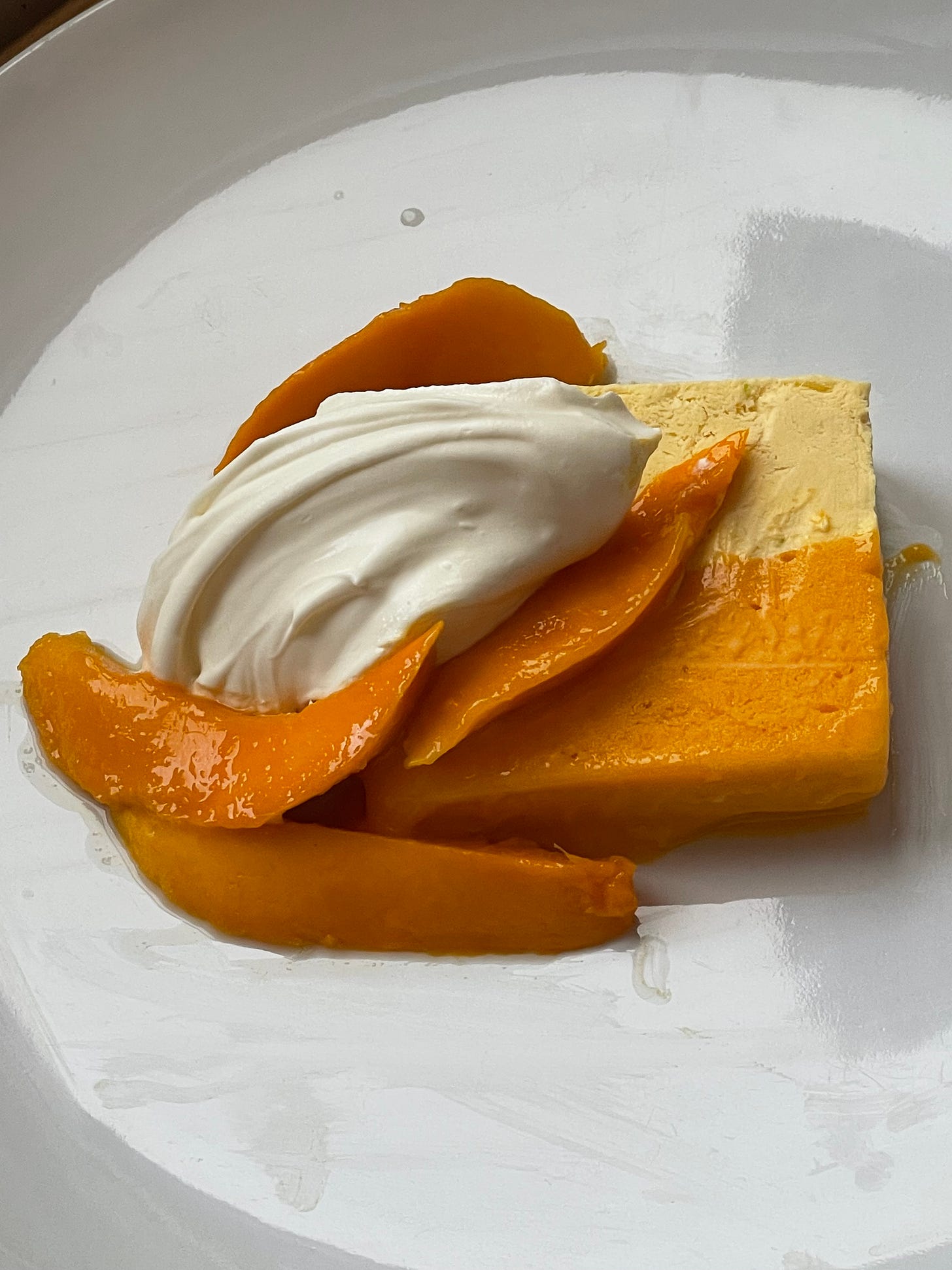 Combined with rich dairy, the aromatic flavour of peak mangoes is elongated. Care must be taken not to distract from the flavour (which is why serving alongside a plain creamy base might be preferable to put together), but if this balance is correctly achieved, it is glorious.