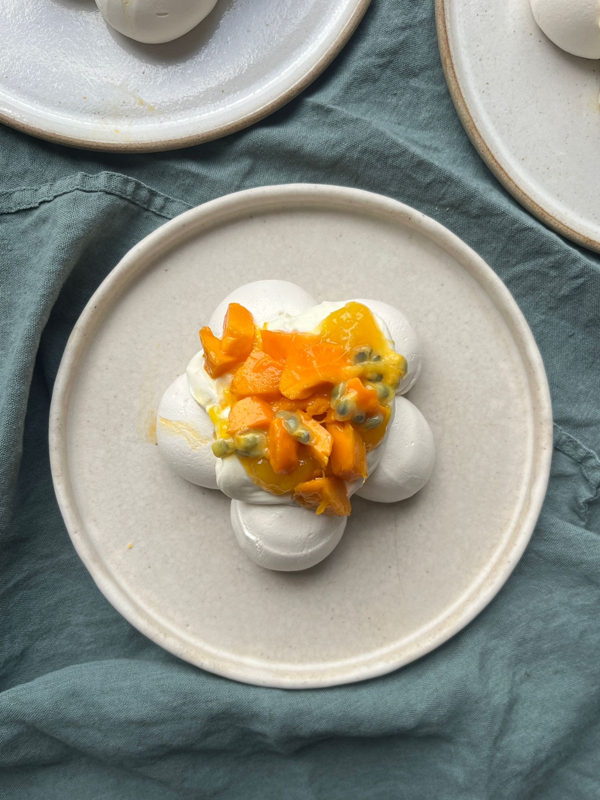 Inspired by the passionfruit posset flower tarts in my book SIFT, I made these adorable pavlovas. Piled with whipped yoghurt, mango jam (or curd, both work well here) and fresh cubed or sliced mangoes, it's a throne fit for our mango queen.