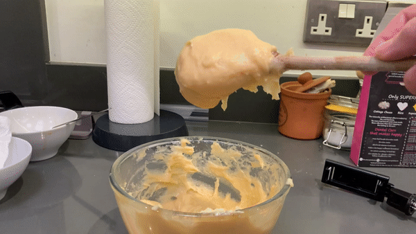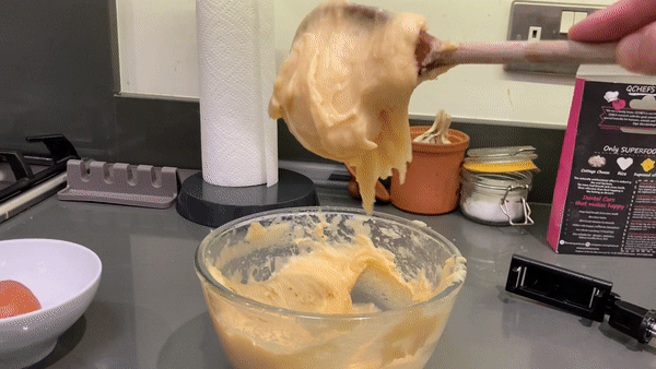 Continue adding egg until the choux paste reaches ‘dropping consistency’ and is very shiny. Here is the paste just before dropping consistency: