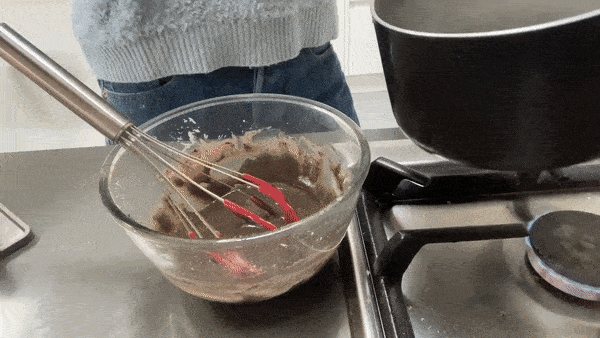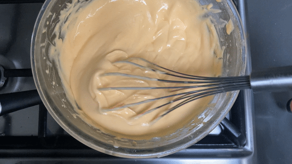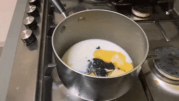 Heat together butter, milk, water, salt and sugar until the liquid is simmering and butter has melted. If you are using black sesame paste, add it to the choux paste now