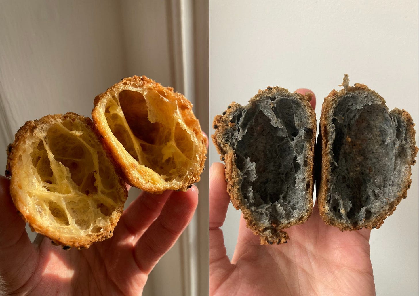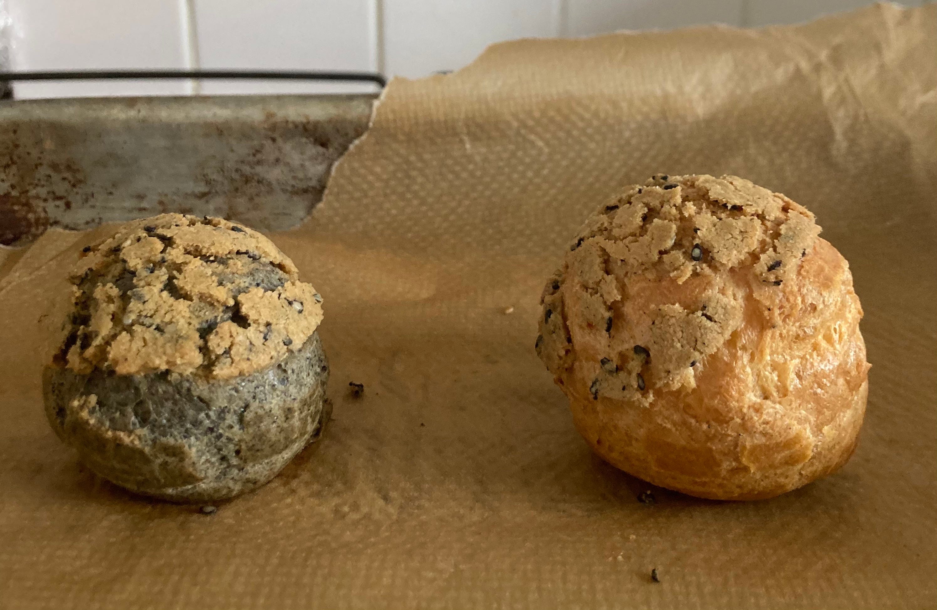 To check that I wasn’t losing my mind, I piped 20g of regular choux next to 20g of the black sesame choux and baked. The result?