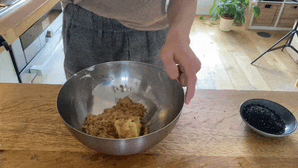 Mix together (not cream - you don’t need any air in this) soft butter and brown sugar. Then stir in the flour and sesame seeds
