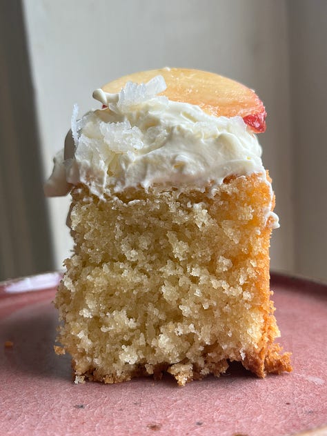 Clearly there are a few winners - creamed coconut should be used, but deployed with care as it is very heavy and dense, though delicious, when added to a cake. The concentrated flavour of the oil along with dessicated coconut gave me the best results, plus tenderness from the coconut milk (the holy trinity I use in my buttery coconut cake, below) I welcome you to test your own combinations, but be aware of the trade-offs - there are, unfortunately, many. Not all roads paved with coconut lead to flavour.