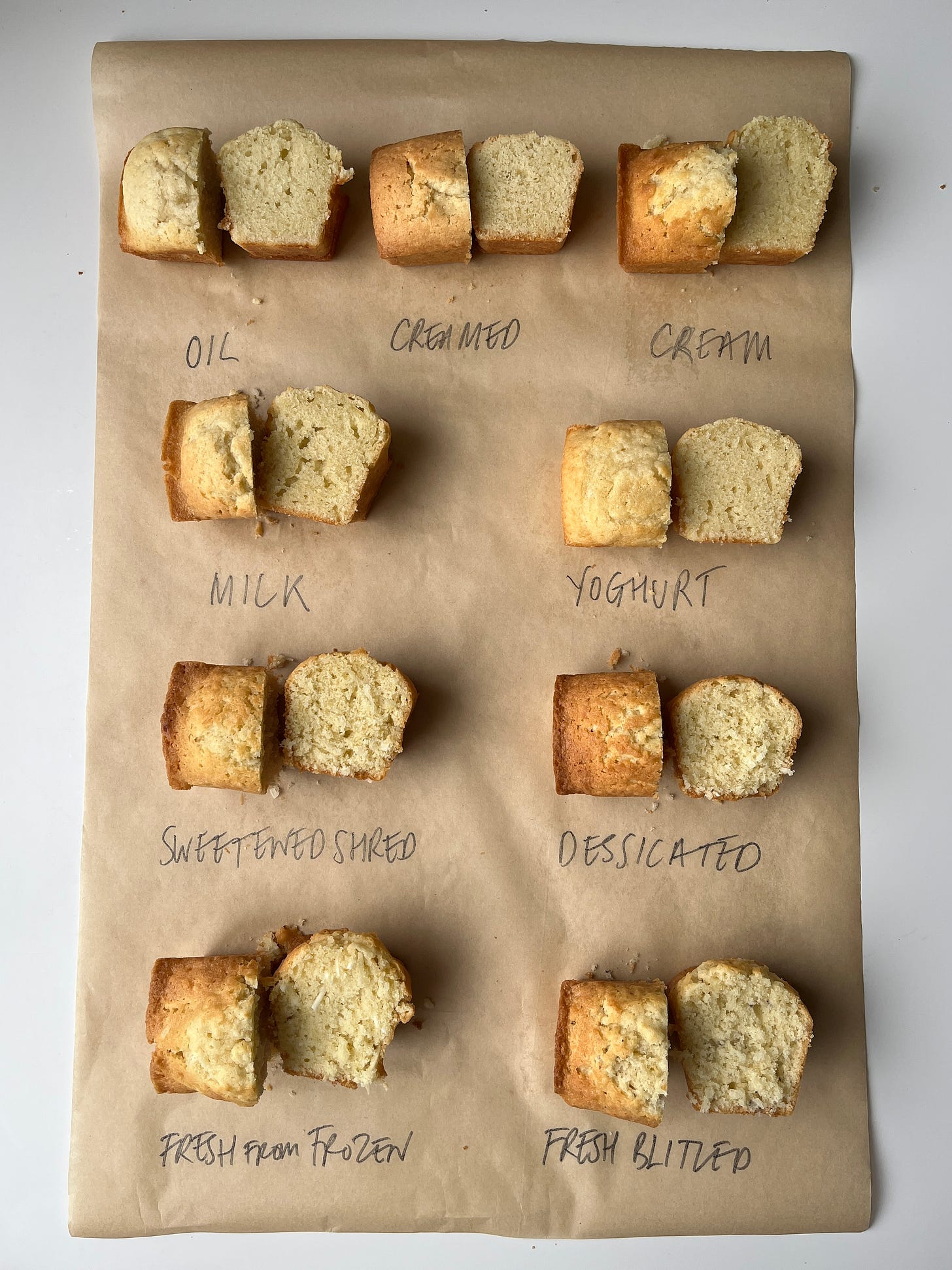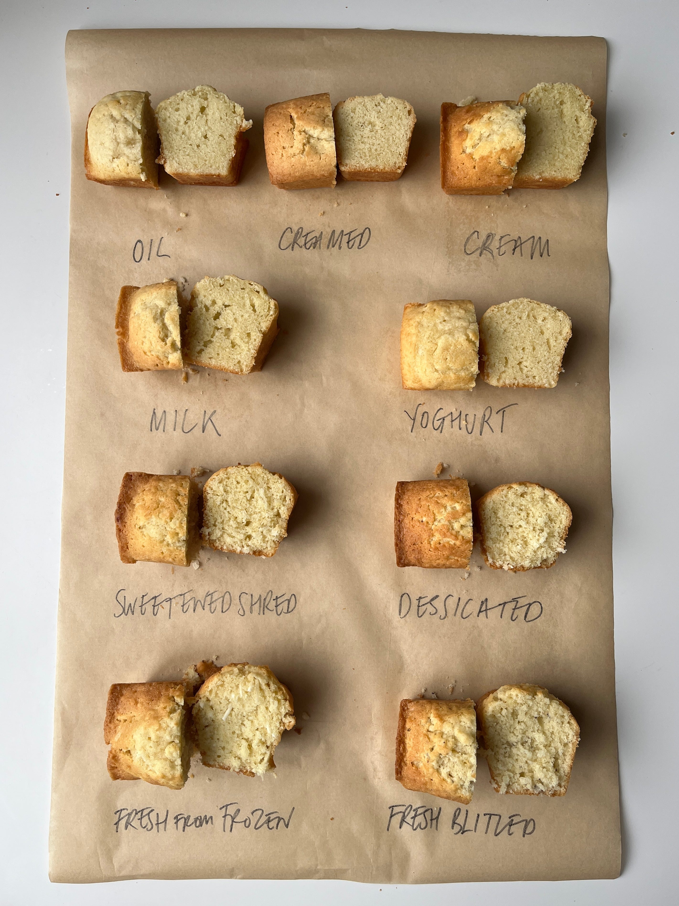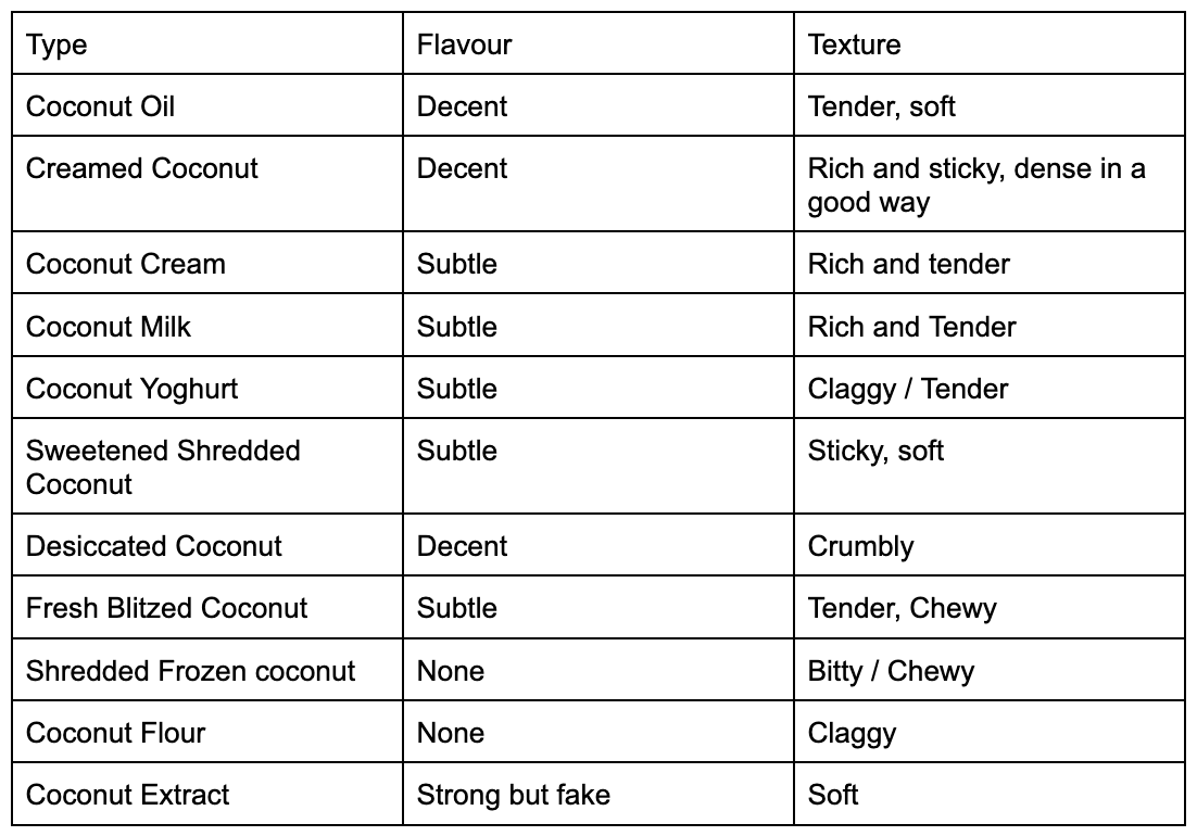 Not pictured: Coconut flour and extract. I tried both of these - coconut flour is very dry if used in conjunction with regular flour, and the flavour was minimal. I think it is a good idea to use a portion of coconut flour or blitzed desiccated coconut as a non-gluten-forming solid to add to cakes, but I am not strong enough in gf baking to understand the best way to deploy it. The extract is successful, but Iâm not sure - even if it is a natural flavouring, why does the extract always taste so dang fake?Â