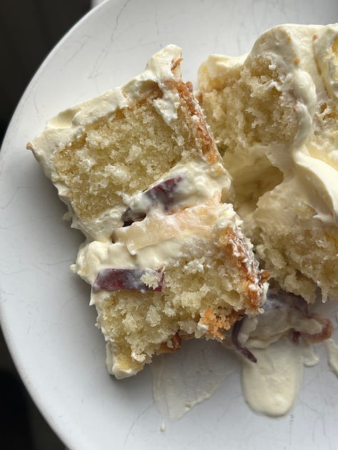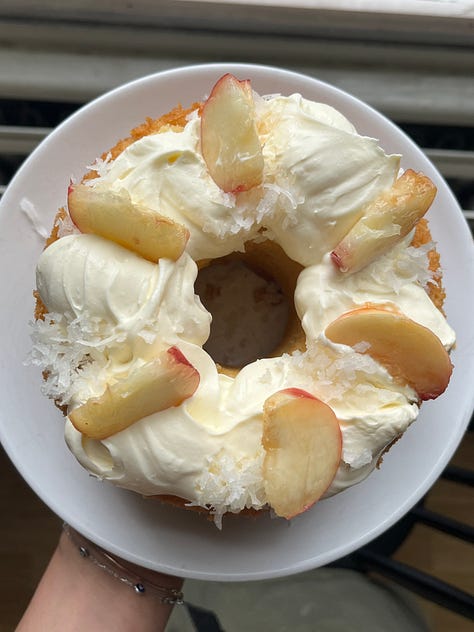 Buttery coconut cake with sour cream whip and peaches (below!)
