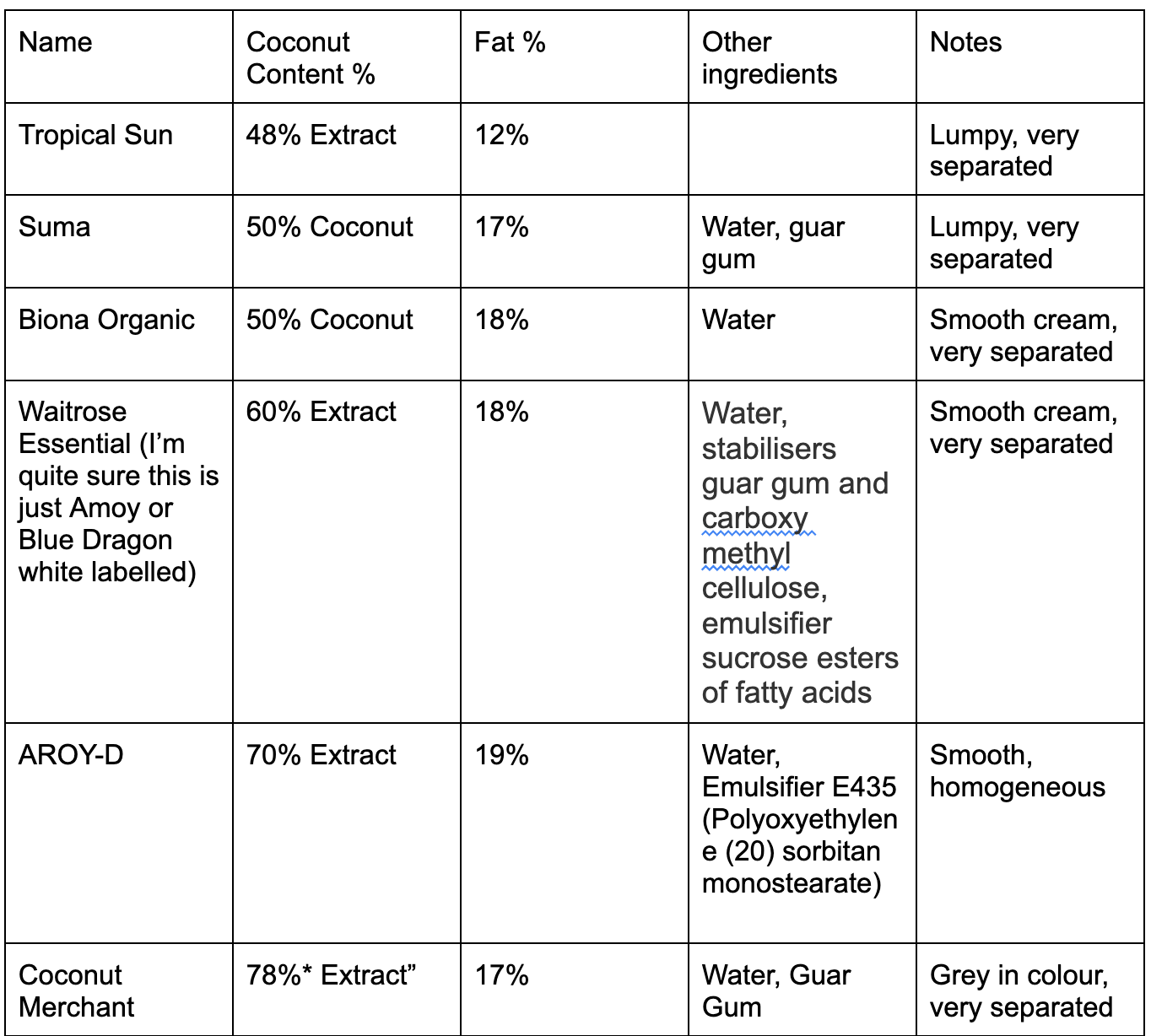 I picked up 6 options to compare - all of these are sold as coconut milk but vary wildly.Â