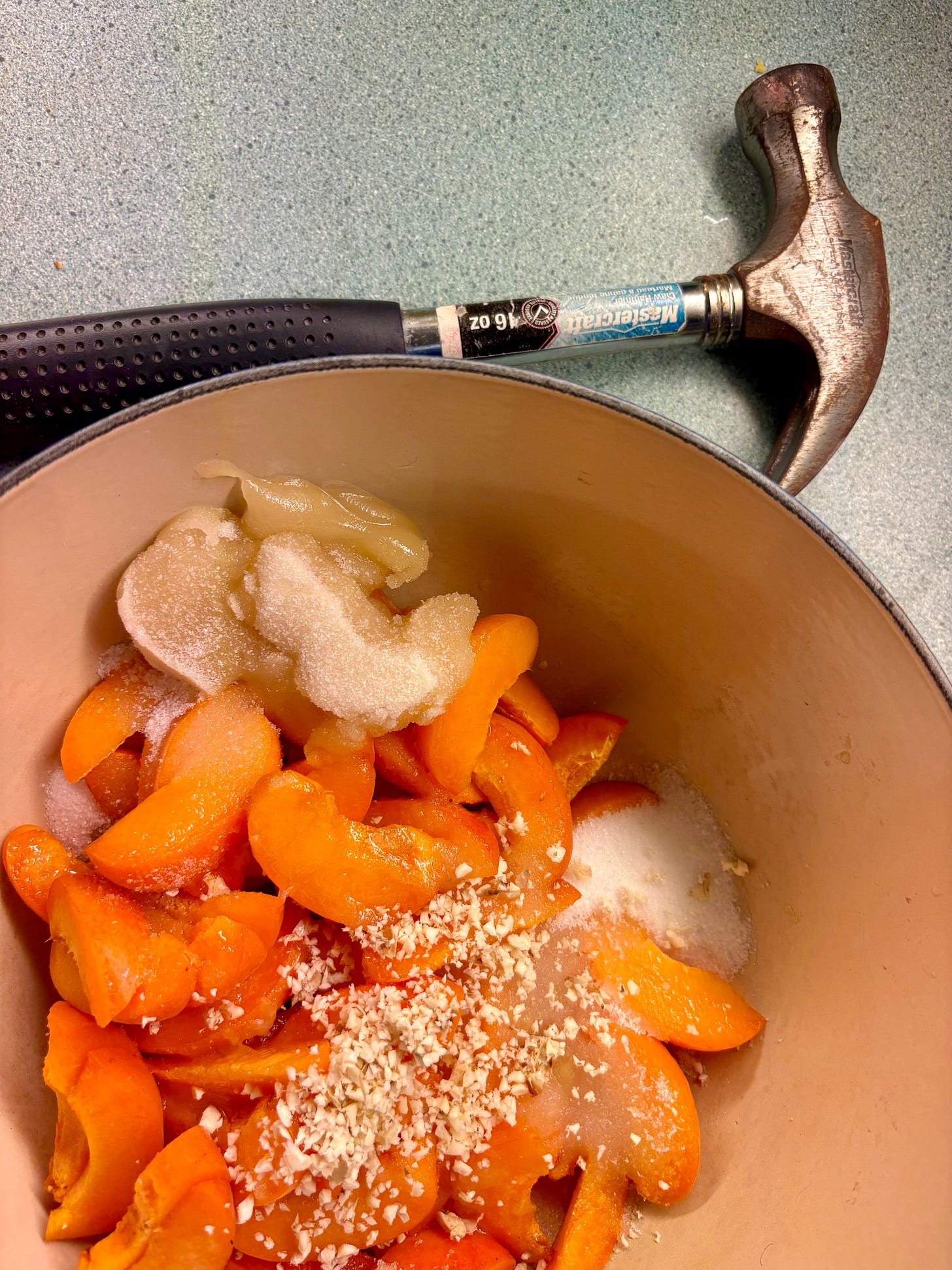 If you’re intimidated by making jam, a small batch is where to start. It’s infinitely easier and makes just enough that there’s no need to jar it. If you make it for the cake recipe that follows, you’ll still have 220 g left to eat slathered on scones or buttered sourdough. And If I’ve scared you, feel free to roast the apricot kernels for 10 minutes at 300°F to neutralize the poison—but I never have!