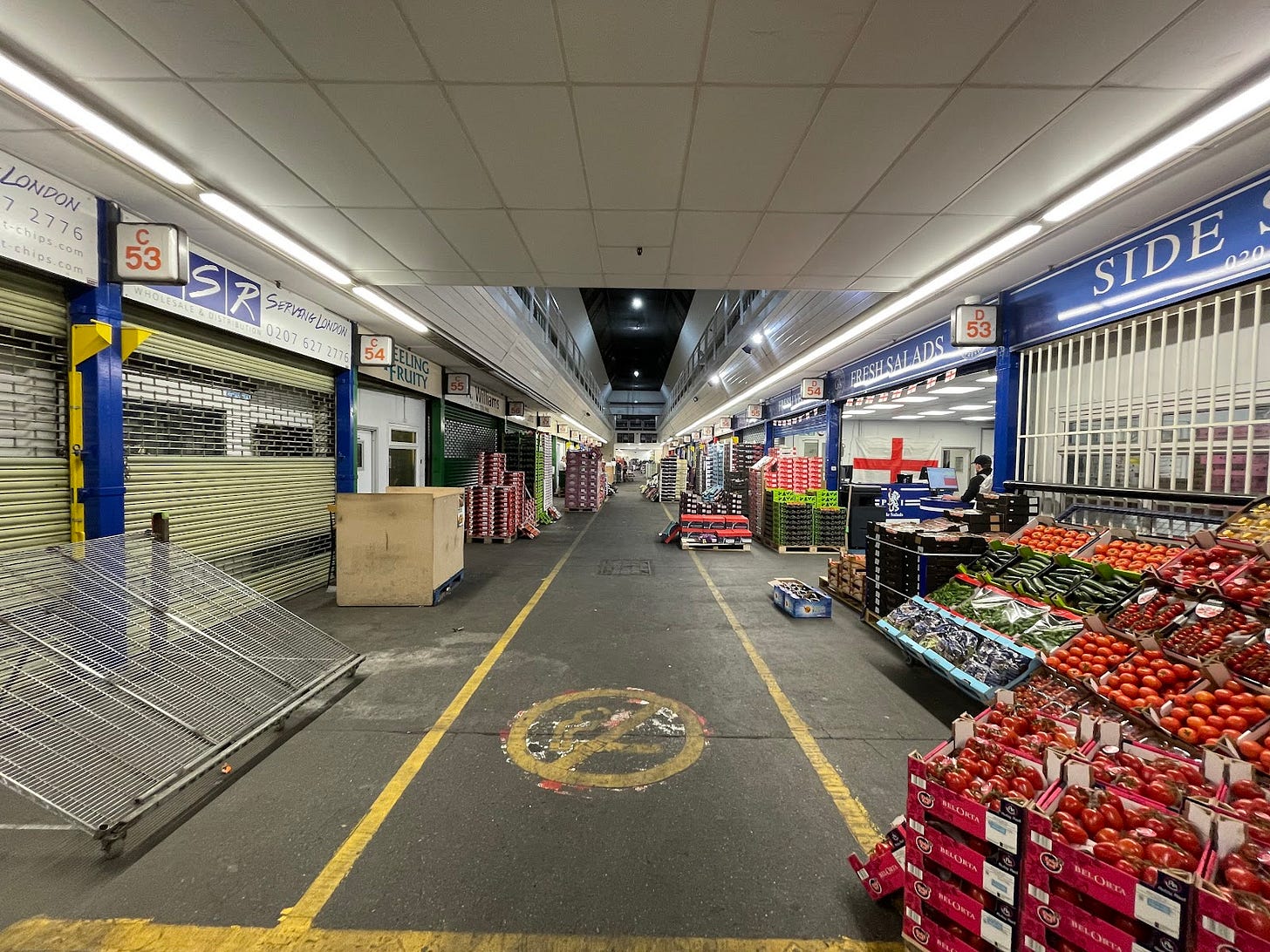 I walked from the train station immediately into streets strewn with temporary bollards marking various stages of construction - as I walked down towards the market, on one side of the road were unassuming residential strips and the other an orange glass behemoth Sainsburys superstore. This sort of inorganic juxtaposition, combined with the complete silence of the night immediately set the tone for the strange world I was about to enter. While I understood the basic premise of the market, I was going in otherwise blind. I navigated the maze of temporary fencing to emerge in a dark, nondescript, industrial complex, filled with endless rows of trucks, crates and forklifts milling busily around them. There are very few private shoppers like myself - at the busiest times I went, I saw no more than ten others shopping, and most times none. It was just me, the produce, steel and concrete.