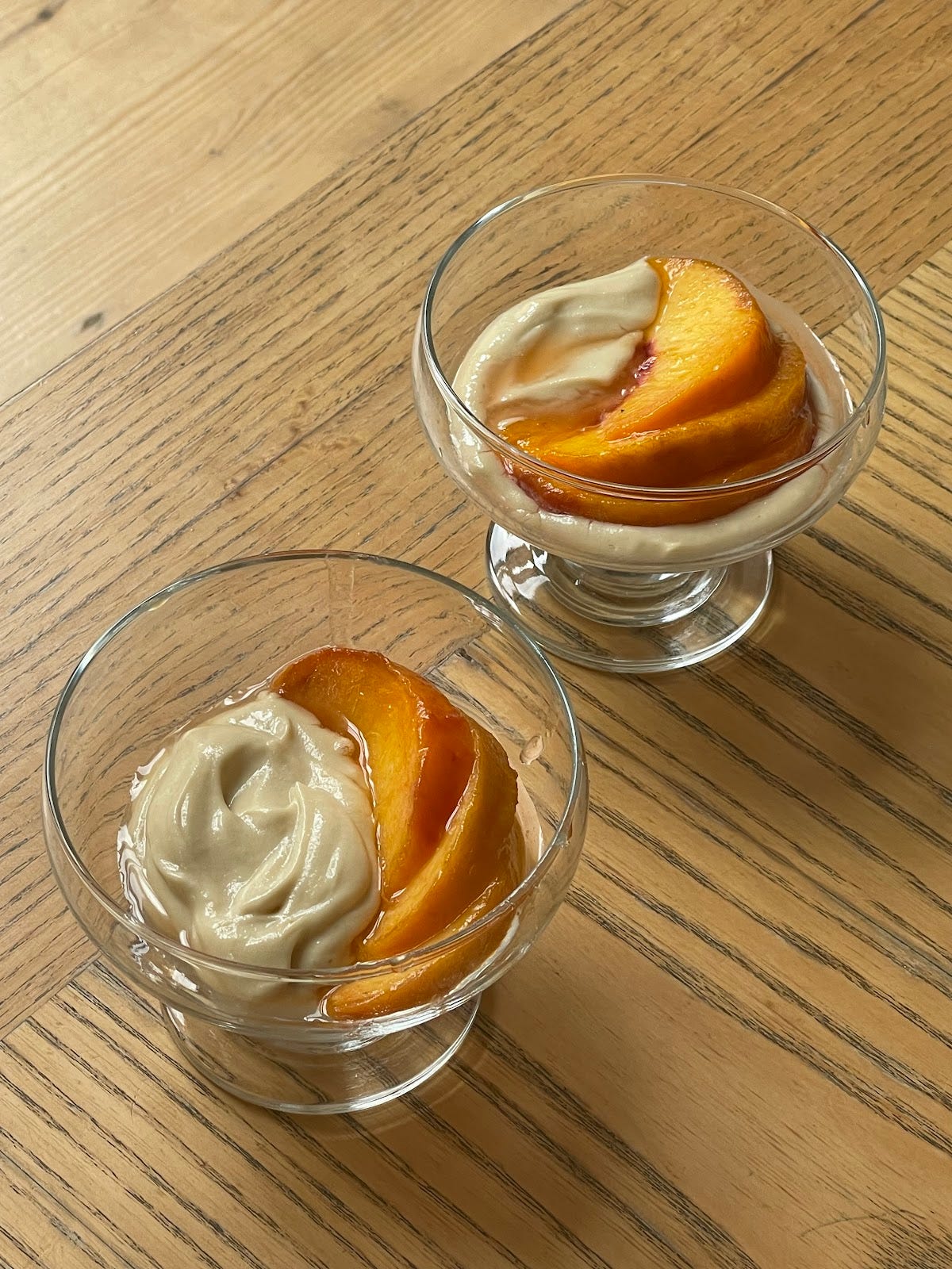 Halve and portion your cooled peaches. Mix your honey and lemon juice and toss the fruit to coat. Serve half a peach per person with the reserved zabaglione.