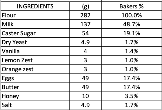 I started off by creating my base recipe. I do this with the help of bakers %! Remember, a bakers % is the recipe proportional to the amount of flour: