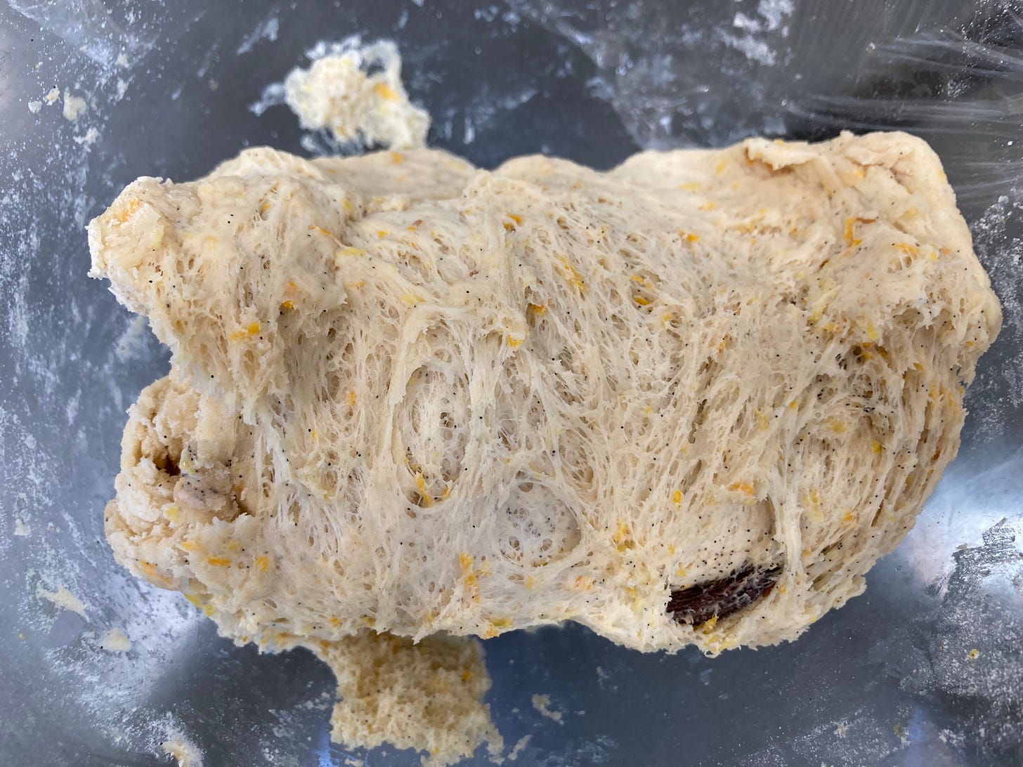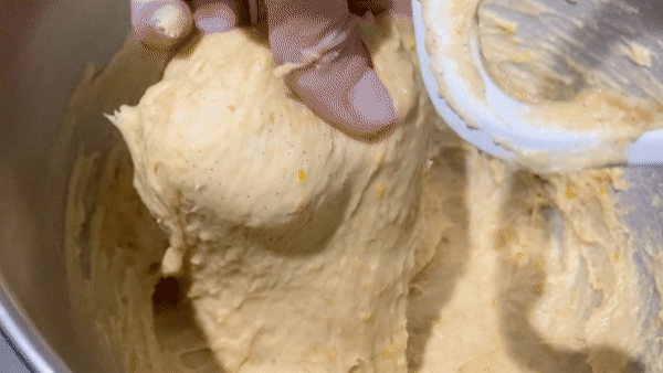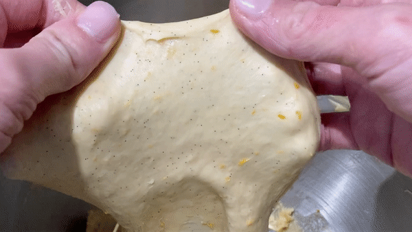 Add in the soft butter a teaspoon at a time with the mixer running. Mix until very smooth – another 8 mins – and full gluten development is reached. This is when you can pull a thin almost translucent layer with the dough