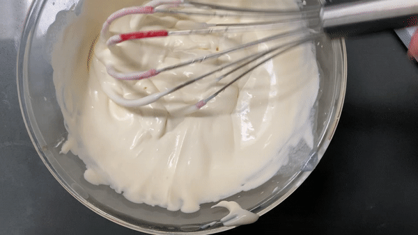 Whisk until thickened and smooth – don’t over-whip it! It should just be ‘soft’. It will firm up as you move it around so watch out! Err on the side of caution and go under!