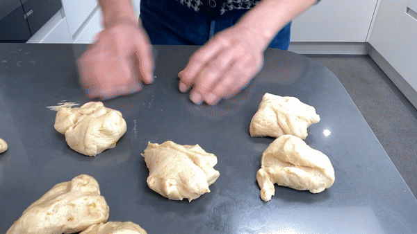 Starting with the first ball (that has been resting the longest) shape into a slight sausage using your hands in a ‘v’ shape and put onto a tray. Try to do it quite tightly otherwise it’ll go into a strange shape in the oven