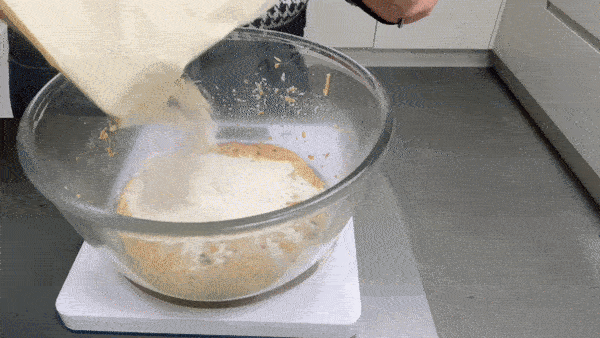 Tear up the pre-ferment into small pieces and add to the bowl. Remove the vanilla pod!